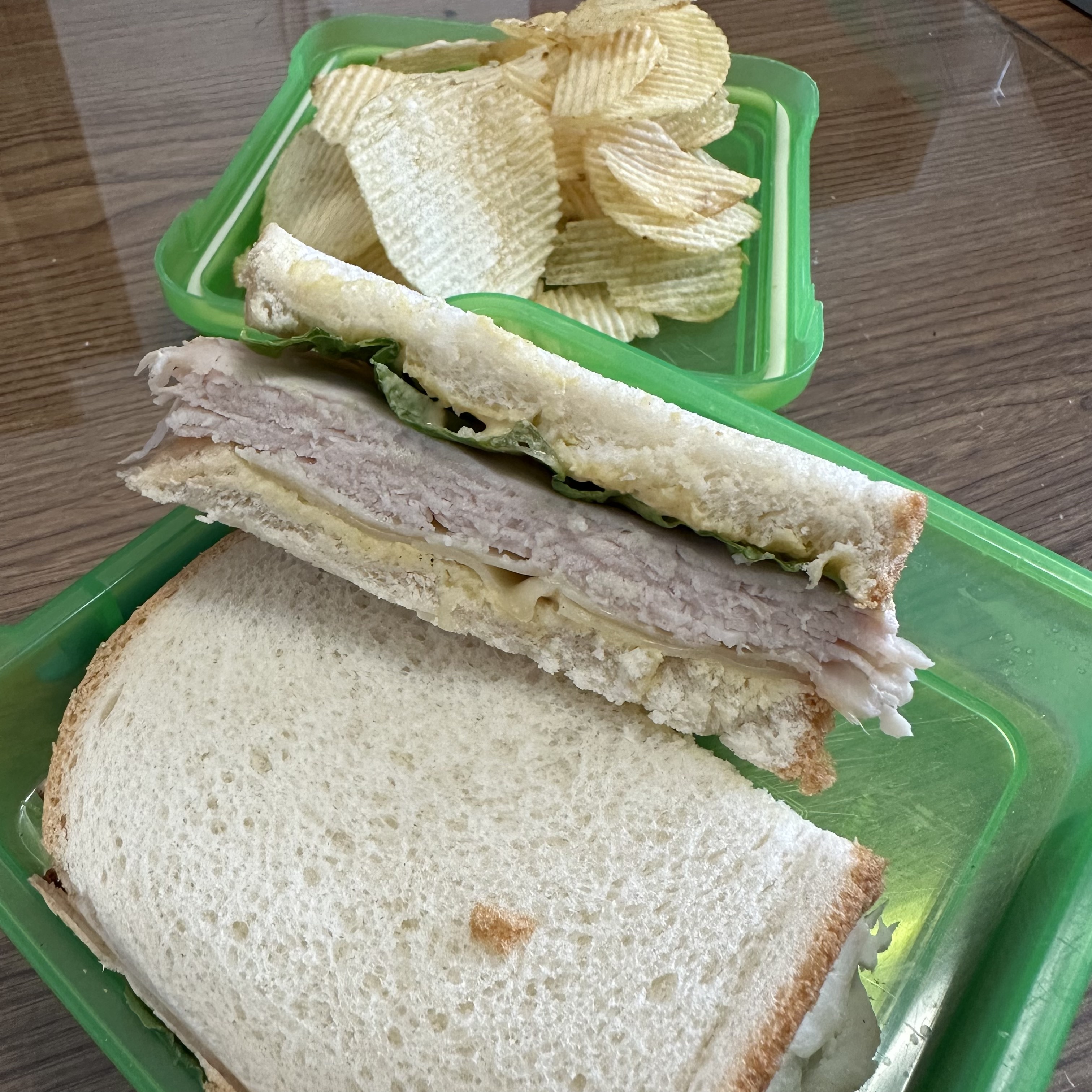 I should go back and look to see when the renovations started at DeNo’s. It’s been a while. Every time I ask how it’s going, they tell me three more weeks. Well today, they aid a couple more weeks, so I’m guessing it will be done in July. Nevertheless, I got a chicken parm sub and ate it at my desk. For dinner, we needed to use up some deli turkey so I made turkey melts with poblanos. I had a sweet tooth and ate chuckles for dessert. Apparently my son had already been given the red one.