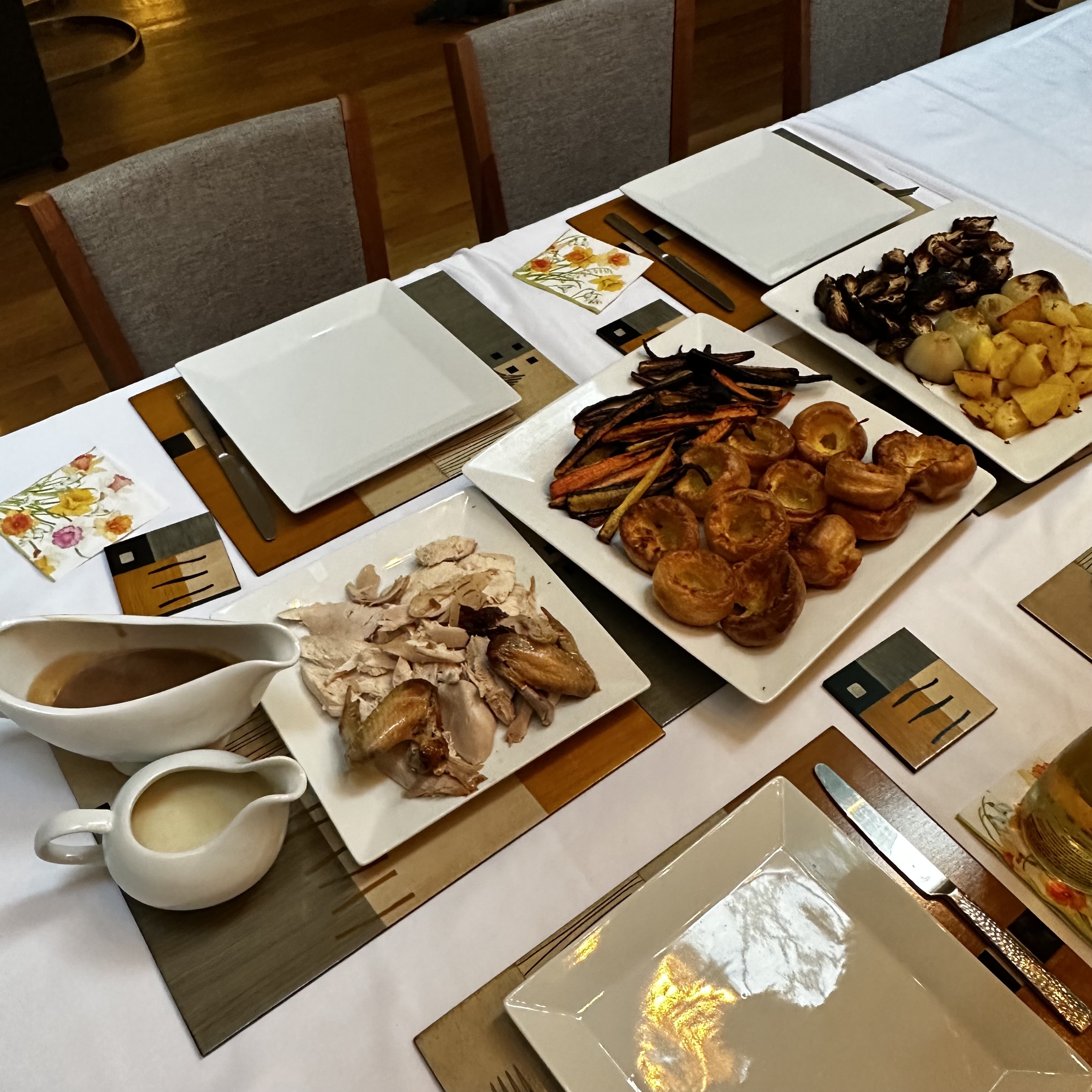 For dinner, we were invited to our friends Georgina and Spencer’s. Georgina is from England and made us an incredible British roast dinner with an amazing chicken, Yorkshire pudding, carrots, potatoes, brussels sprouts, onion, bread sauce, and brown gravy. Before that we had cheese and prosciutto, goat cheese puffs, and truffled chicken mousse. For dessert, she made Eton mess, which I had never had let alone heard of. It’s a delicious combination of whipped cream, meringue and berries. It was an awesome meal.