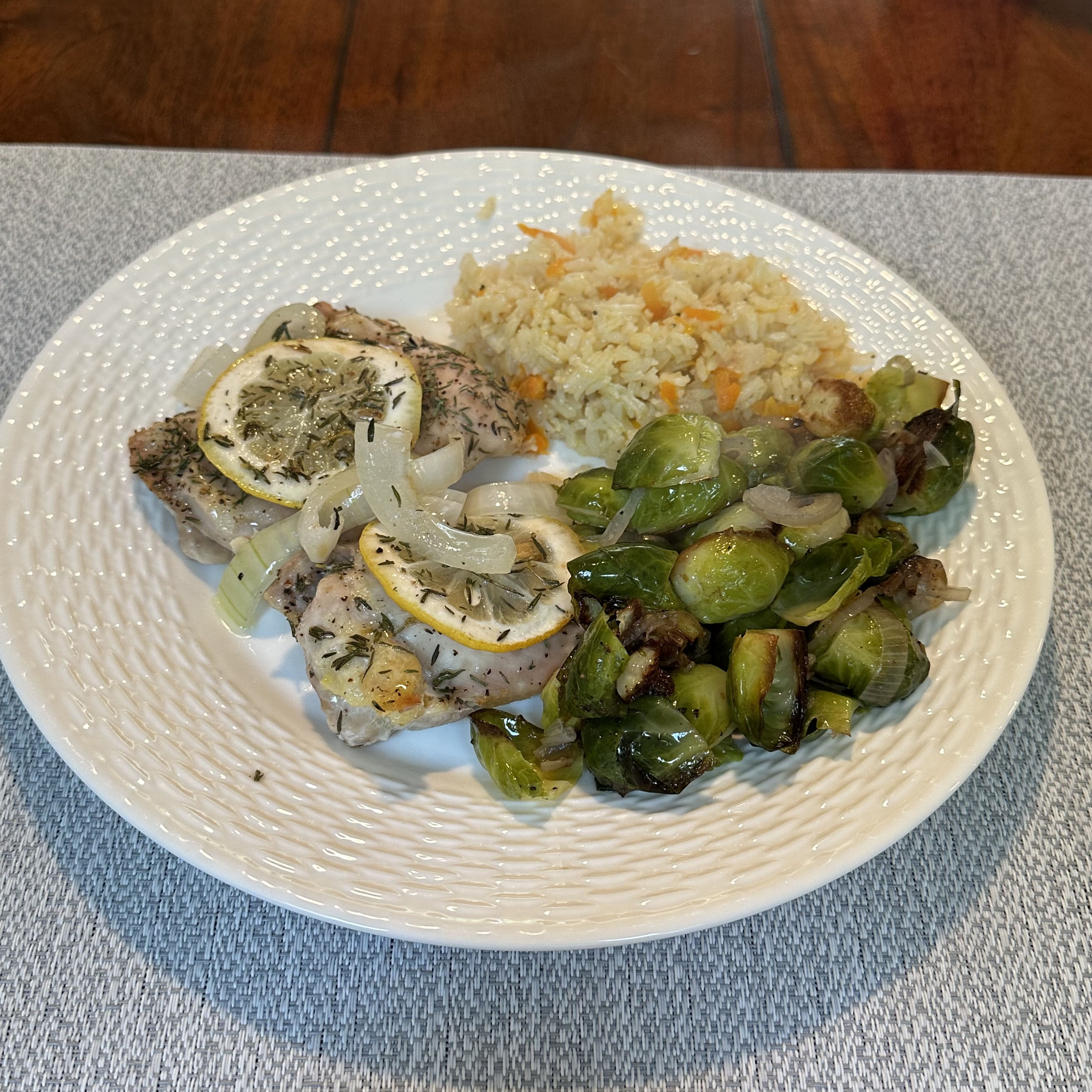 It’s probably no surprise given everything I ate recently that my weight is not where I want it to be. I tried to eat a little better today. I just had a roast pork sandwich for lunch with a few chips. For dinner I roasted some chicken with onion, lemon, and thyme. I also made carrot rice and brussels sprouts. I might have slightly repeated Sunday night’s dinner.