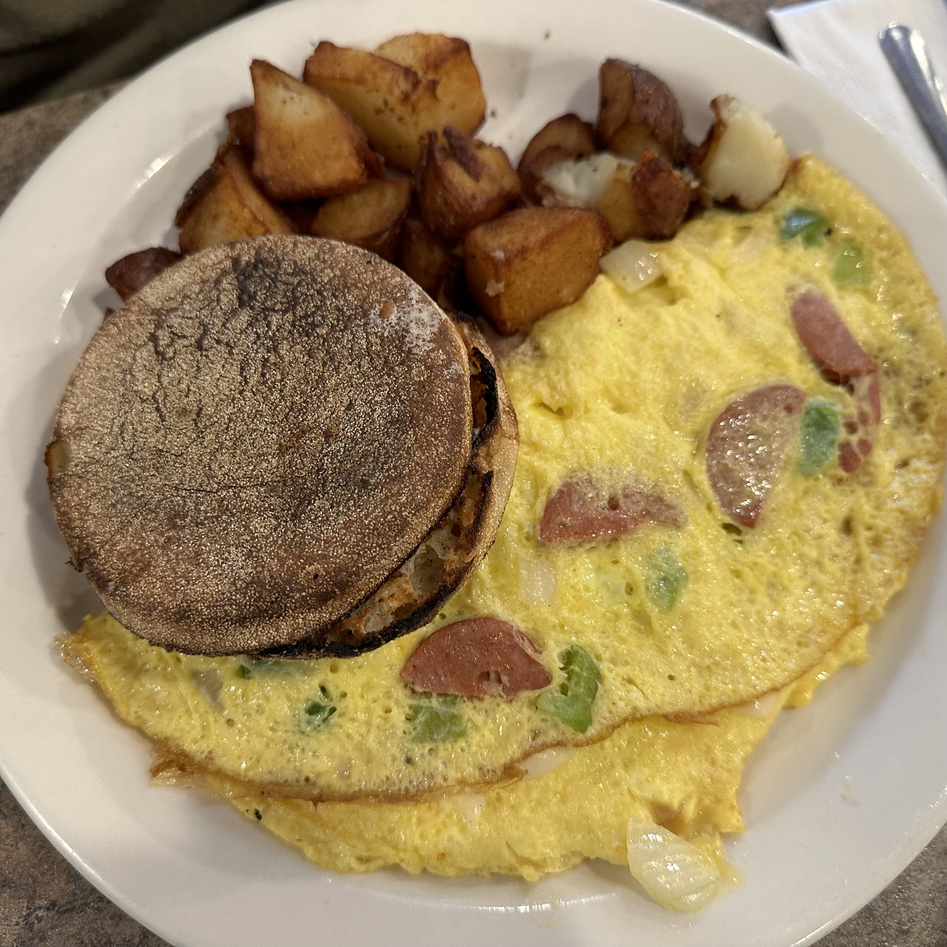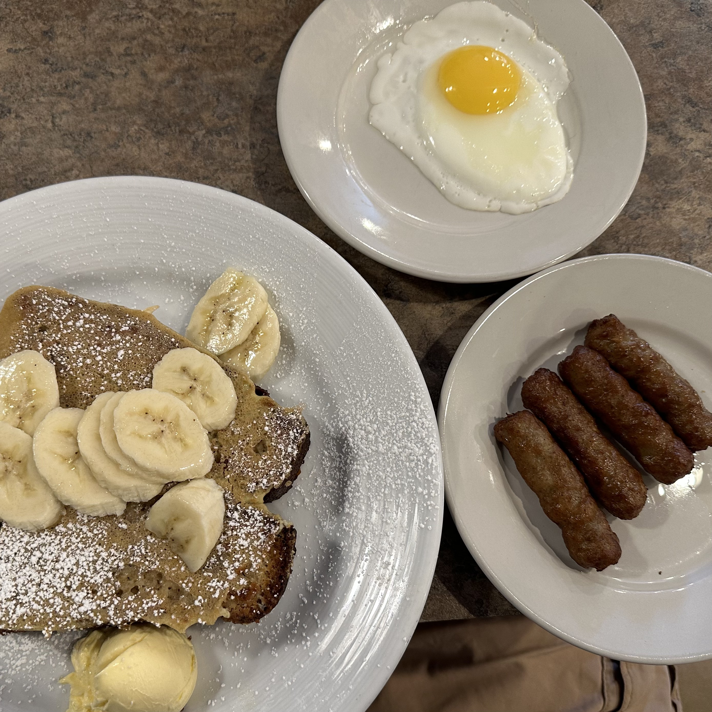 We stayed the night last night in Mansfield so we wouldn’t have to drive home after the concert. Before we went home we stopped at Cafe on the Common. I got the banana bread french toast, which was more bread than french toast. I also got some sausage and an egg. I finished the end of my wife’s omelette and her home fries. She picked better than I did. For dinner, I just had a bowl of cereal.