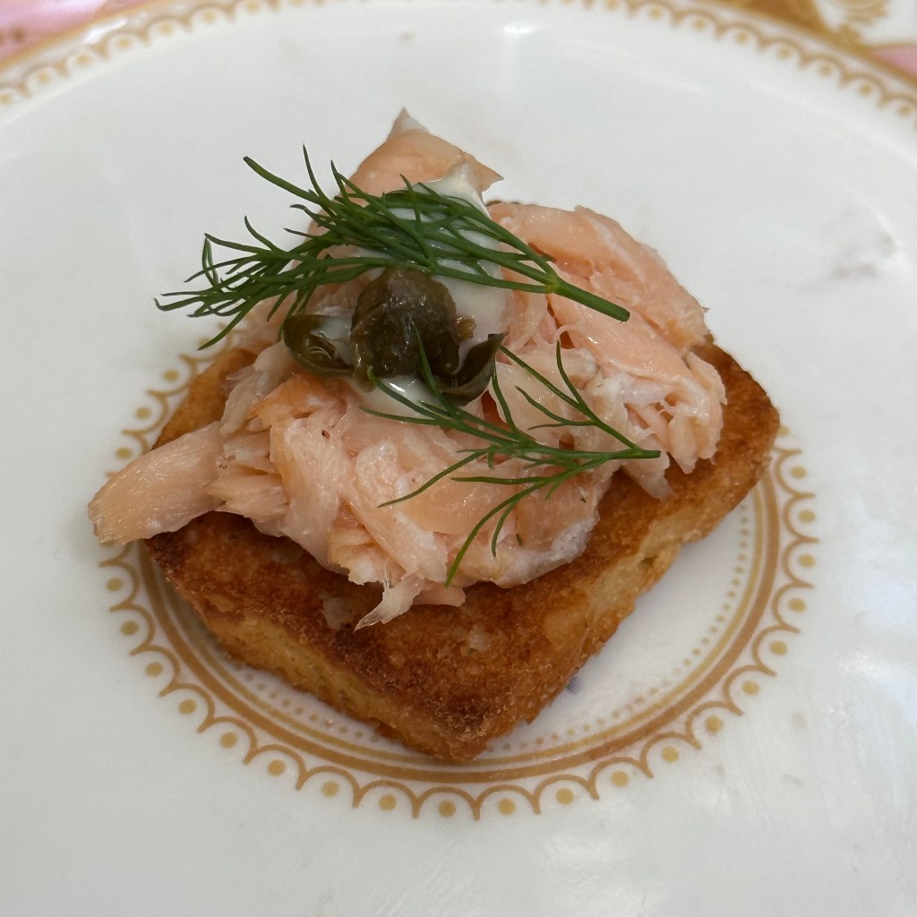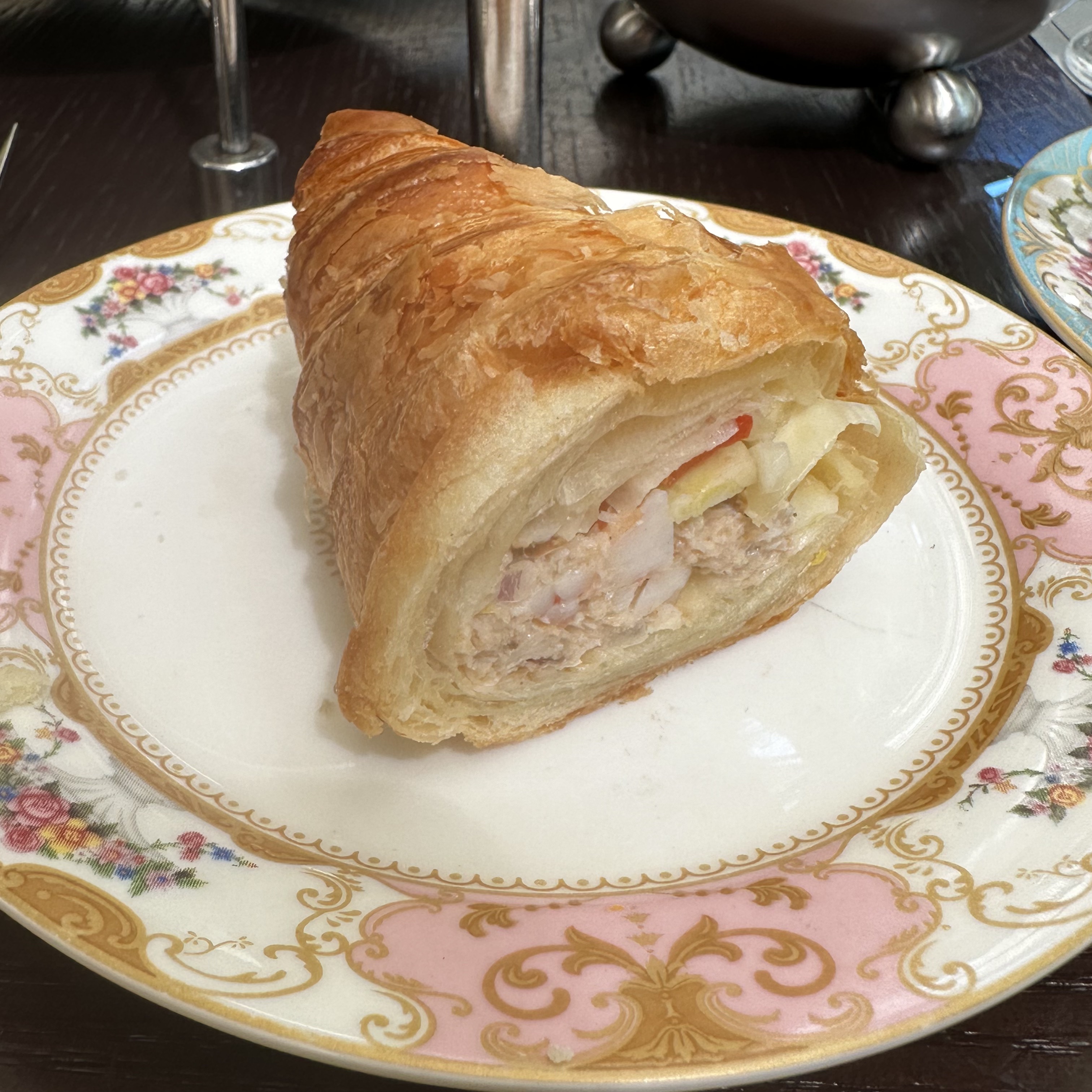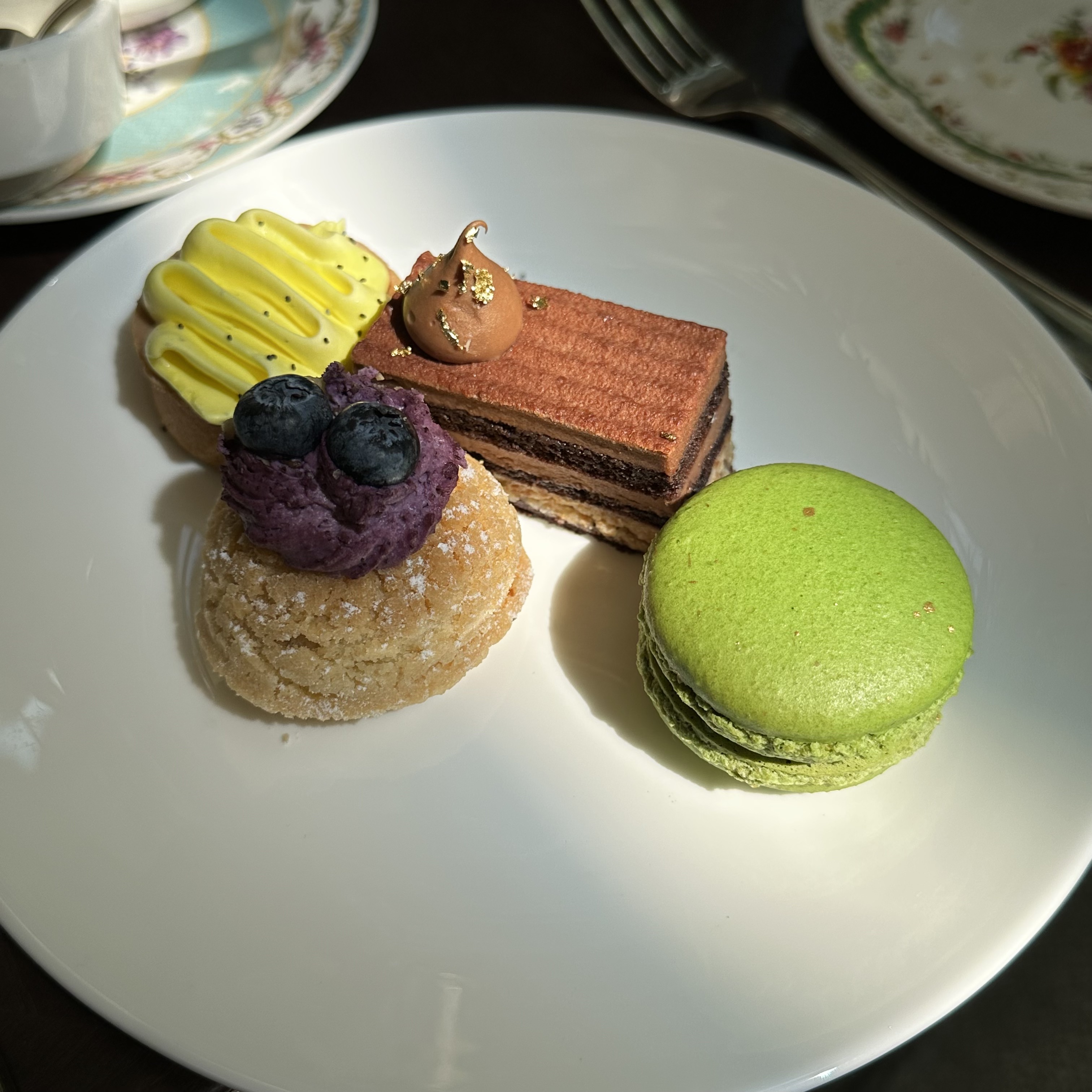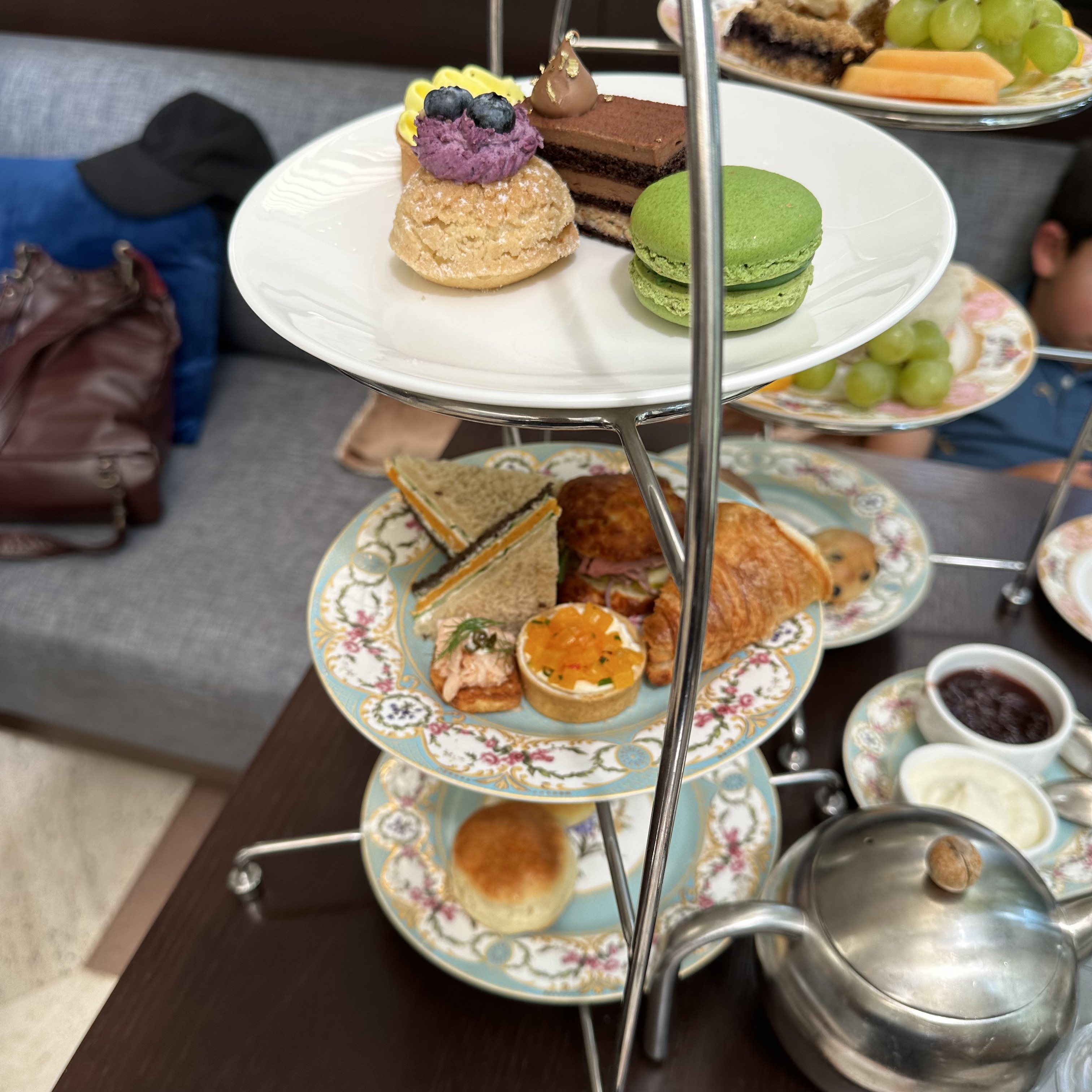 The tea tower is three levels high. While the menu is fixed, they do allow for substitutions for allergies or even taste preferences. The first level is scones, one blueberry, one original. They are best enjoyed with mascarpone and jam. Above the scones are the savory tea sandwiches. My favorite was the crab salad on a light flakey croissant, but all of them were very good.