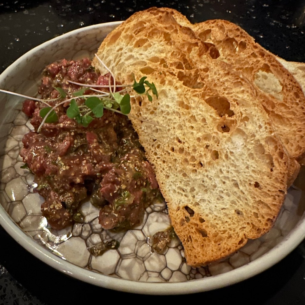 I thought that would be the end of my Zoe’s experience, but we ended up getting hungry again around 10:00. Zoe’s kitchen is open until 10:45 and their bar is open until midnight on Saturday, so we ended up back there for a late night bite. We got the beef tartare which was served simply with crostini. It was pleasantly a little spicy, we think because of the dijon mustard.
