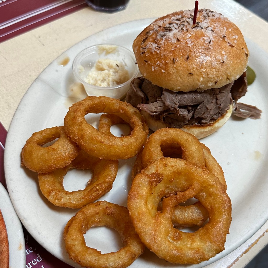 The food here is more than wings, with burgers, sandwiches, pasta, and steaks. I ordered a Cottage Street, their version of beef on weck. If you don’t already know, beef on weck is another Buffalo specialty food, a roast beef sandwich served on a bun topped with salt and caraway seeds called a kummelweck roll. It comes with chips, but I upgraded to onion rings. I particularly liked the salty bun especially with some horseradish on the beef. And the onion rings were a good call, nice and thick with good batter.