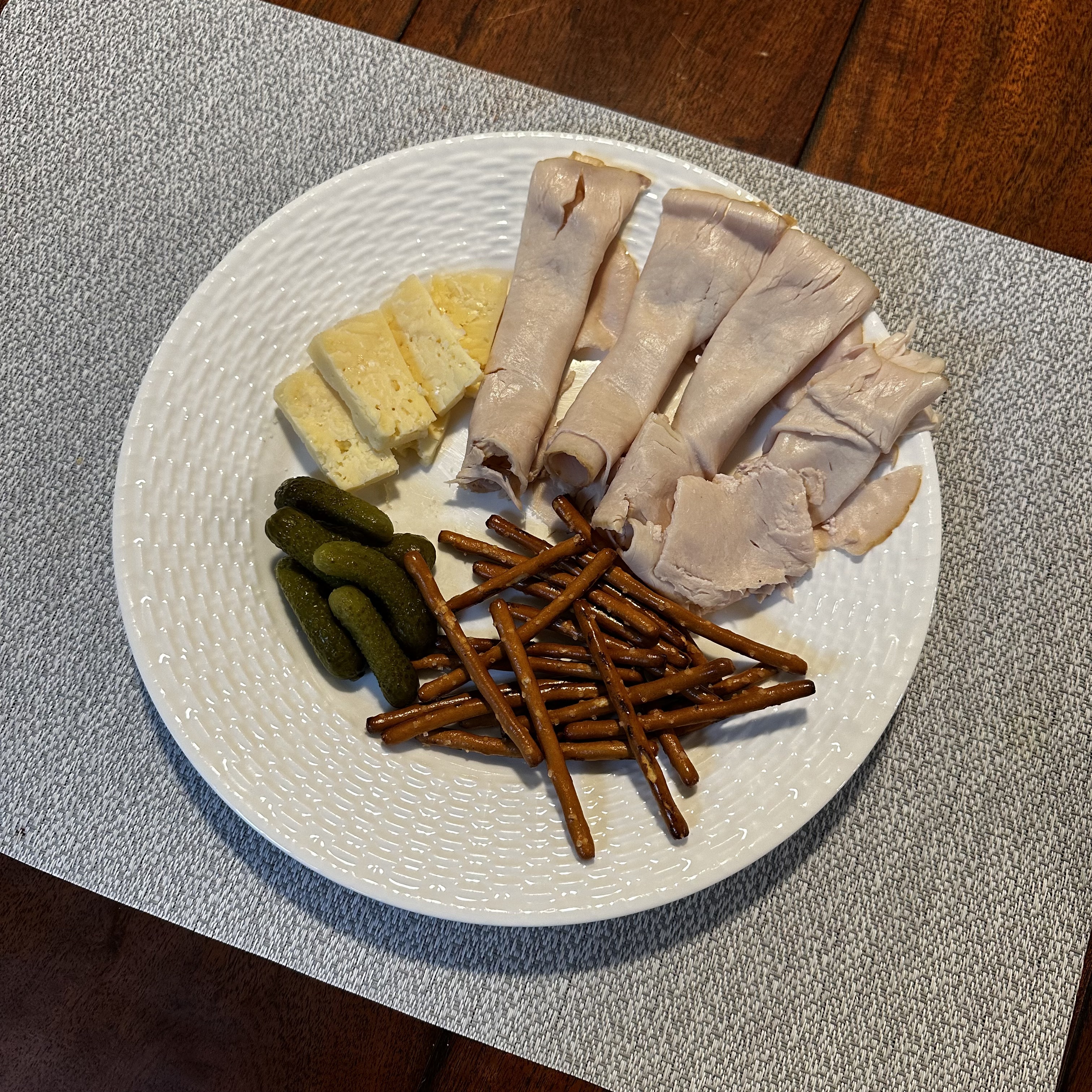 My weight was in better shape today which is good because I ended up eating a donut. I also had the Grown Up Grilled Cheese from The Real Deal. It was good and I would get it again even though the bottom of the bread got pretty soggy from all the bbq sauce. For dinner I made a plate of turkey, cheese, cornichons, and pretzel sticks.