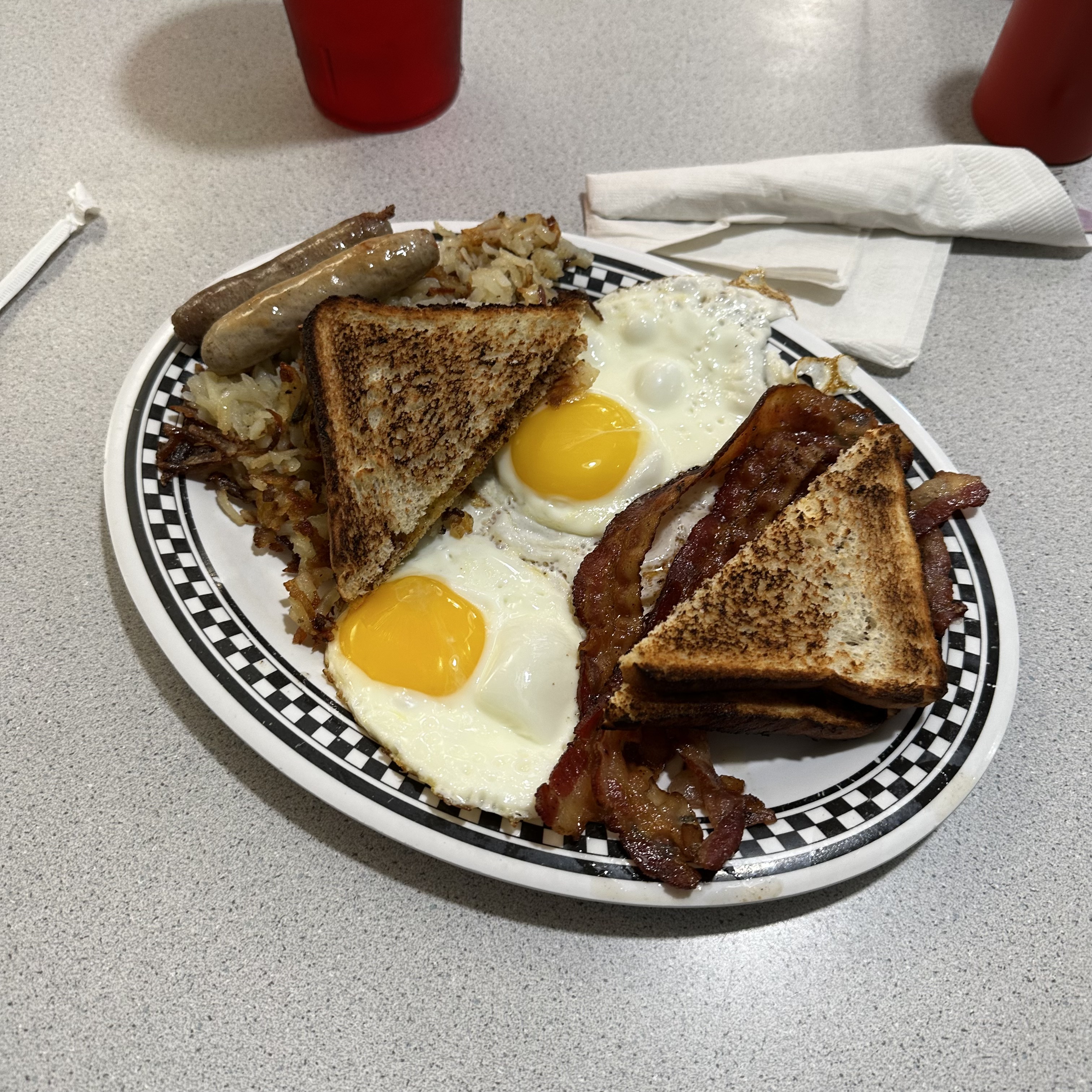 My in-laws watched Thomas for an hour this morning so Kelly and I could attend to a matter in Lowell. I picked him up about 10:30 and was starving. I convinced him to go to lunch at Comets Diner in Tyngsboro. I got the All American Breakfast plus I got to have his sausage links since he won’t try those. I did try a bite of his Mickey Mouse chocolate chip pancake and it was more chocolate than pancake.