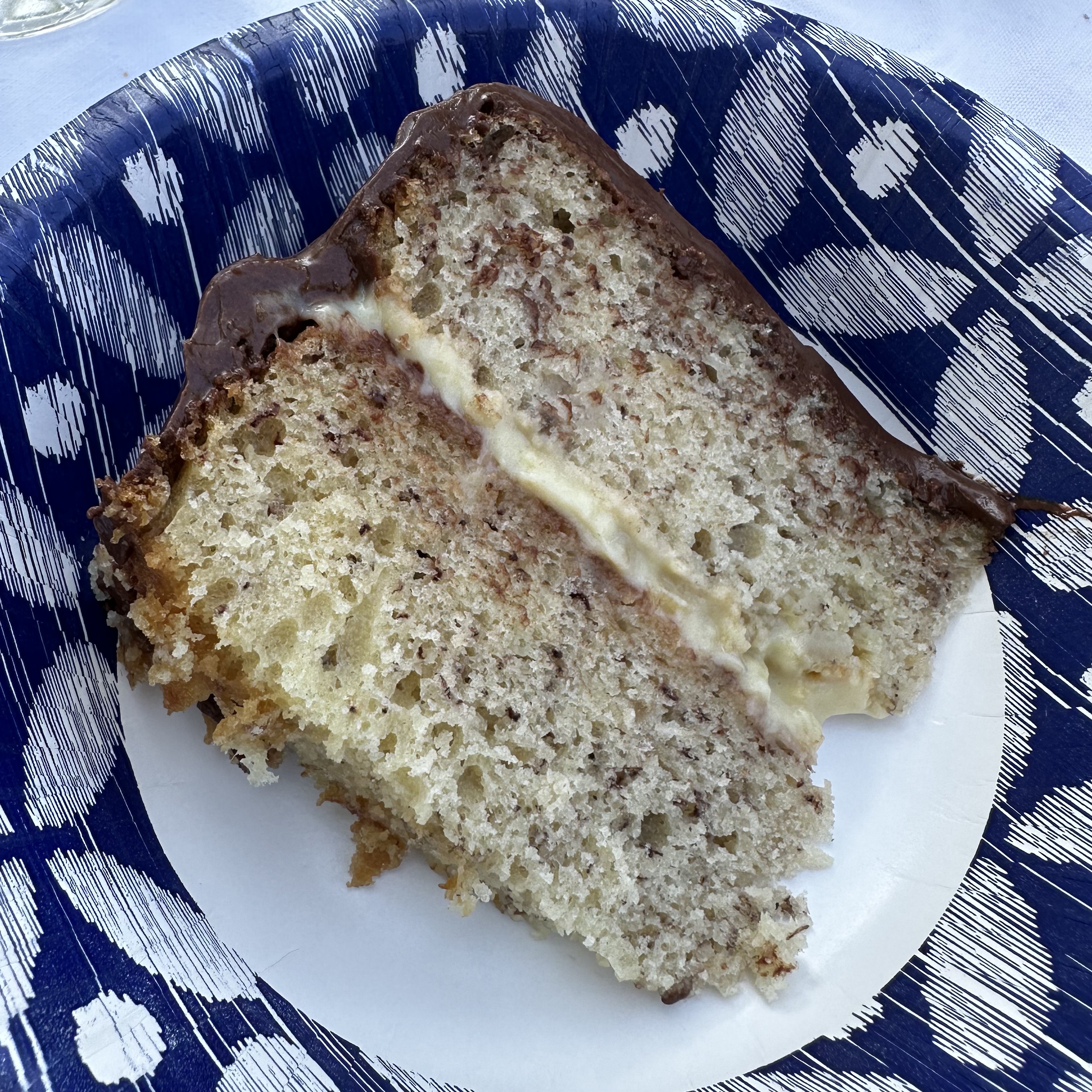 I had planned to have sausage and eggs for breakfast, but the last of the eggs went into my birthday cake so I had sausage and hash browns instead. An egg would have made it better but it was certainly good. After that I went over to Michael’s for a cookout. The list of things I ate was long, starting with smoked bratwurst then chips and dip. After that, I had a plate (or more) of baked beans, chicken, pork ribs, potato salad, cornbread, and mac and cheese. Finally, I had my birthday cake which was a banana cake with banana pudding inside and covered in chocolate frosting.