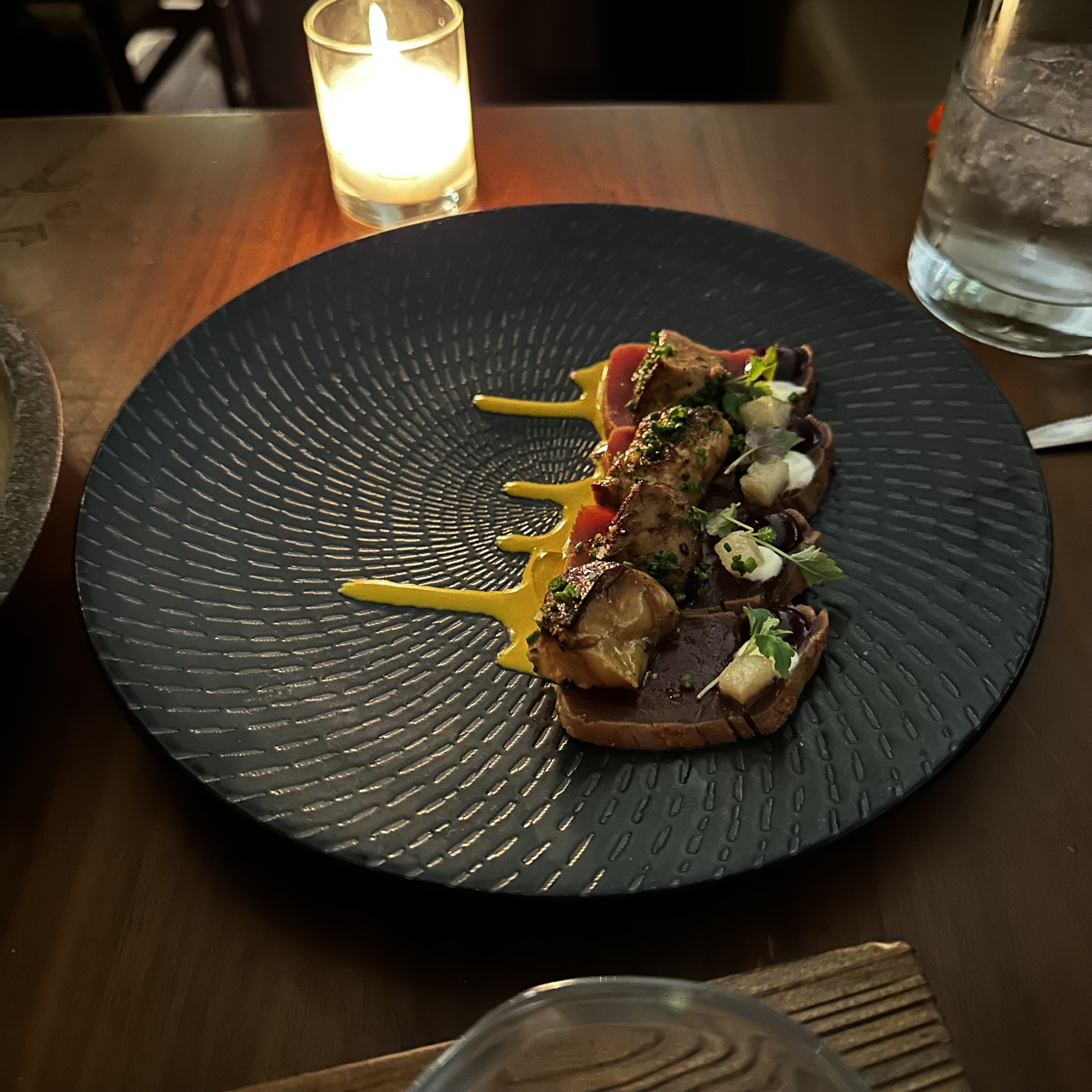 The Dungeness Crab Fried Rice is loaded with herbs and large chunks of crab, but the bites with pineapple are the most exciting. The pineapple makes the dish. Next came the visually stunning Spicy Tuna & Foie Gras Tataki, their signature dish. And finally we adored the grilled quail. It’s not always on the menu which is a shame because it is truly special. The semi-boneless quail is lightly seasoned with curry, tender and juicy. It’s served over swiss chard and accented with pickled grapes.