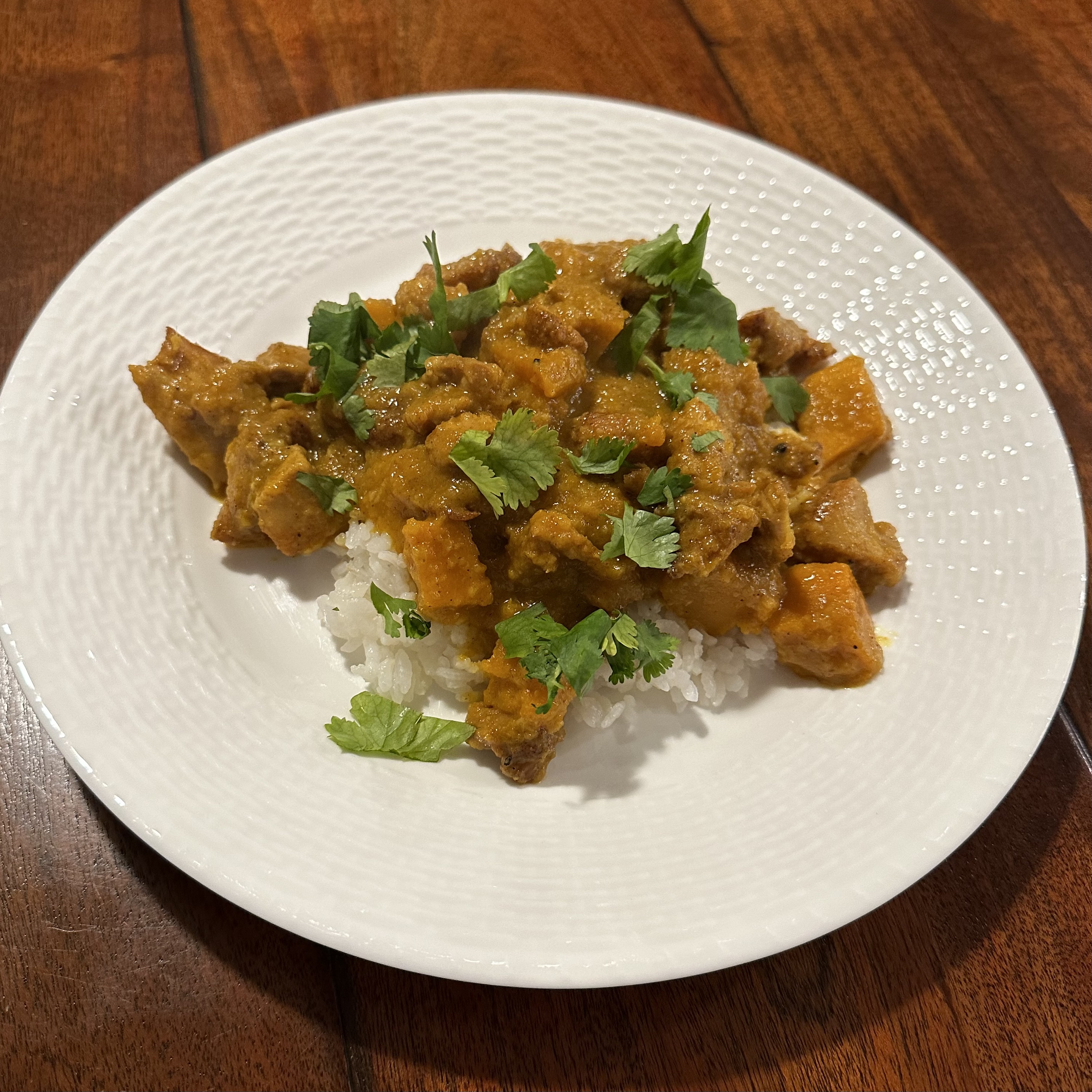 Here’s my quick version of the recipe. I pureed onion, garlic, and ginger in the food processor. I chopped chicken and seasoned it with 2 tsp of curry powder. Then I fried it in 1/3 cup of oil. I took it out and added the onion mixture along with four cardamom pods and another tsp of curry powder. (too much?) I cooked that down then added 2 cups of diced squash and the chicken. Then I added 1/3 cup of water and 150g of plain yogurt. I cooked the whole thing on low for about an hour. I served it over rice with some fresh cilantro. I didn’t love it, but I’ll keep trying.
