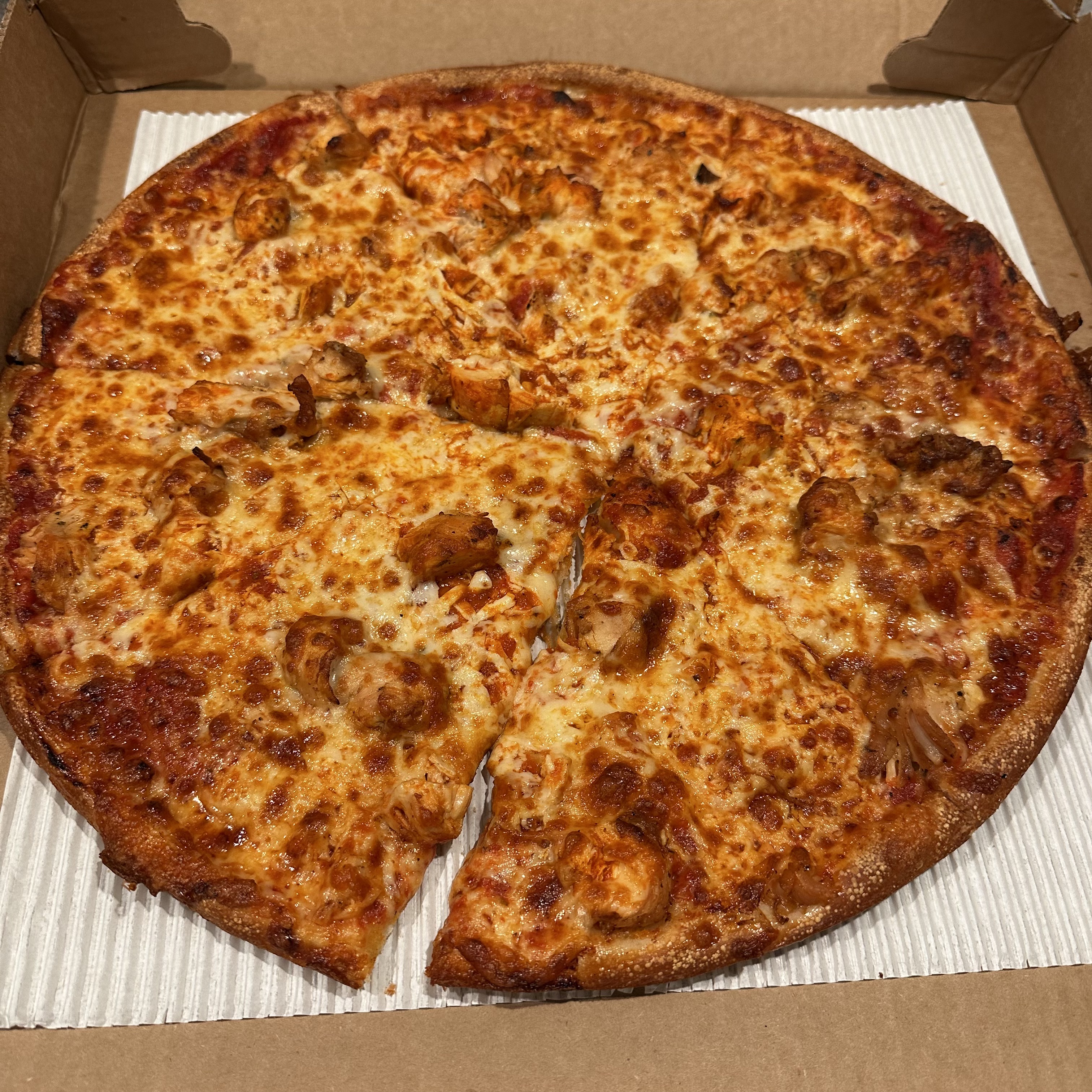 I didn’t really eat much all day, just snacked. For dinner we got a buffalo chicken pizza from New London. It was a little different today, the crust was not how it normally is and whoever cut it did a crappy job. But that didn’t stop me from eating five slices, way more than I should have.
