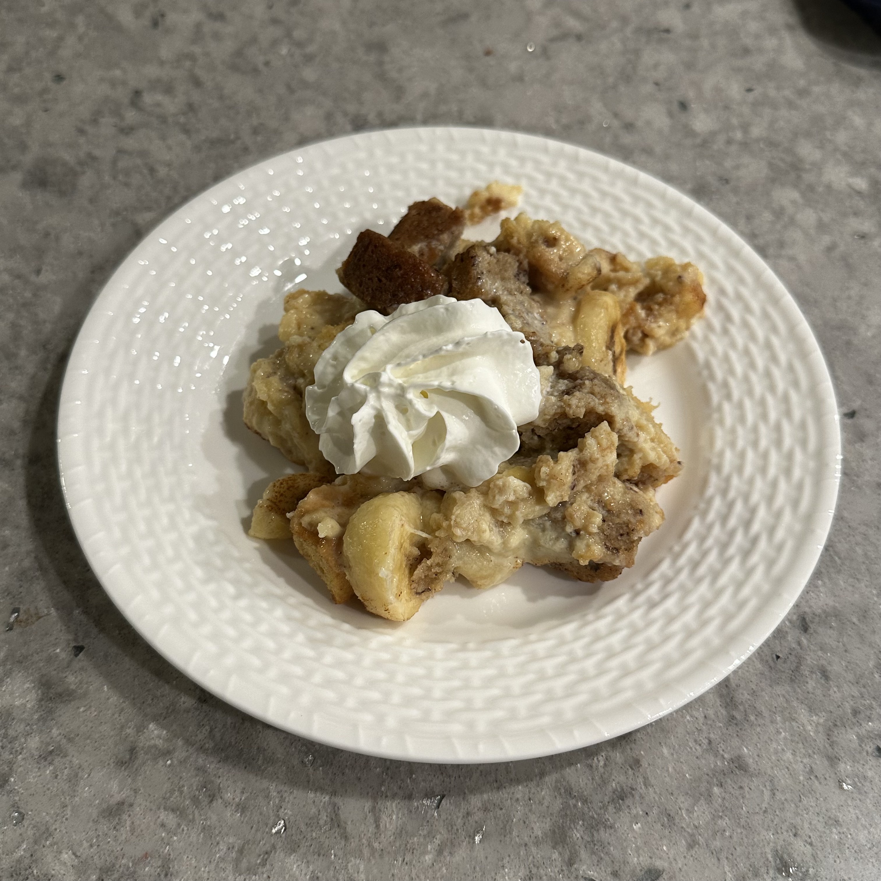 I also made dessert. It’s not something I do often, but I had a little leftover banana bread and two leftover cinnamon rolls. I cubed it all, let them get stale, and then soaked them in a custard made from 1/2 cup cream, 1/2 cup milk, and an egg. I also added sliced banana and some brown sugar. It turned out pretty good, enough that I would do it again.