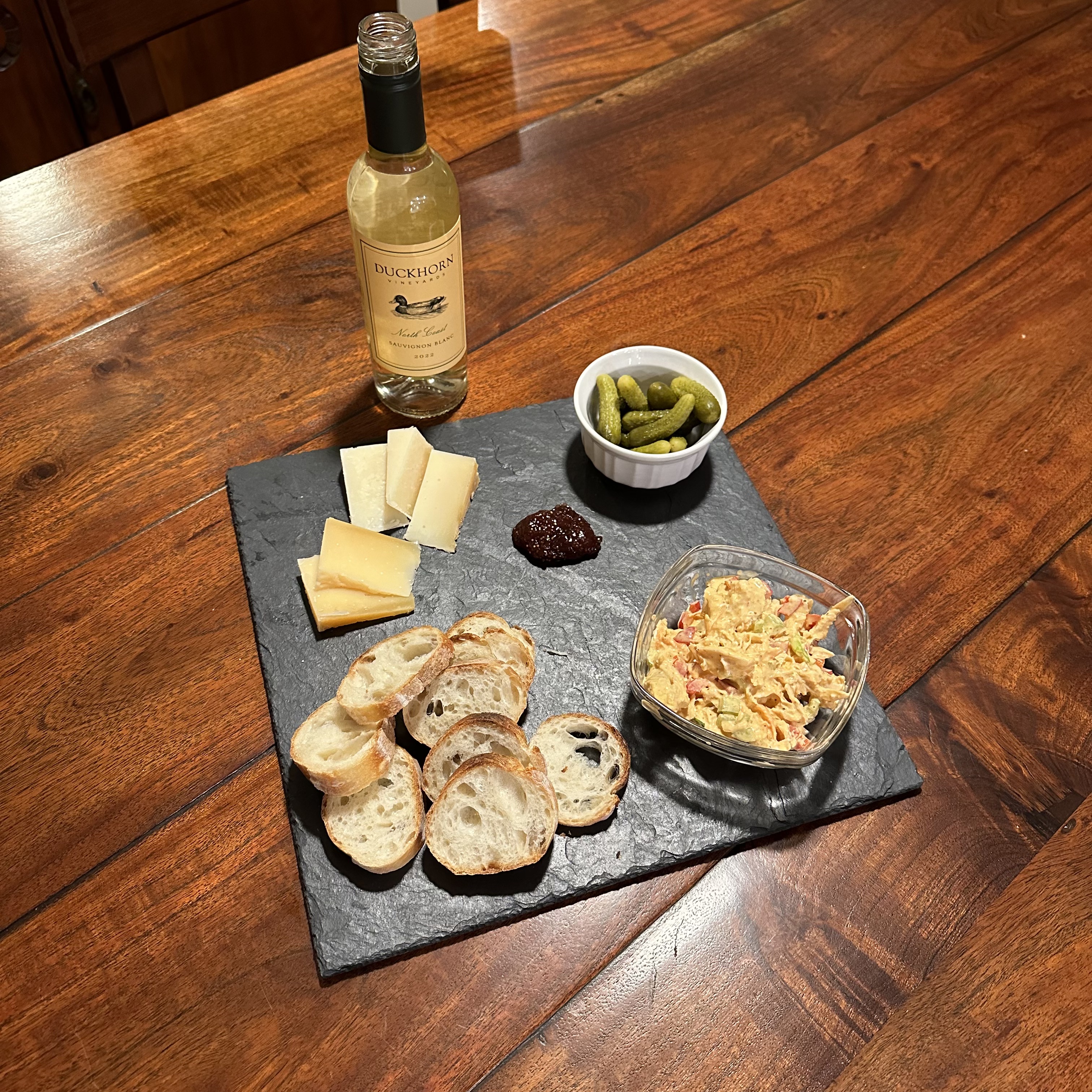 I stopped at The Concord Cheese Shop on my way home from work. I got two pieces of cheese, Le Secret de Compostelle and Beppie. I also got a baguette from Bread Obsession. I have not found a better one in Boston. Then, I got some of their Thai Chicken Salad. I made a charcuterie board adding some fig jam and cornichons left over from New Year’s. We had a half bottle of Duckhorn Sauvignon Blanc. Everything was delicious.