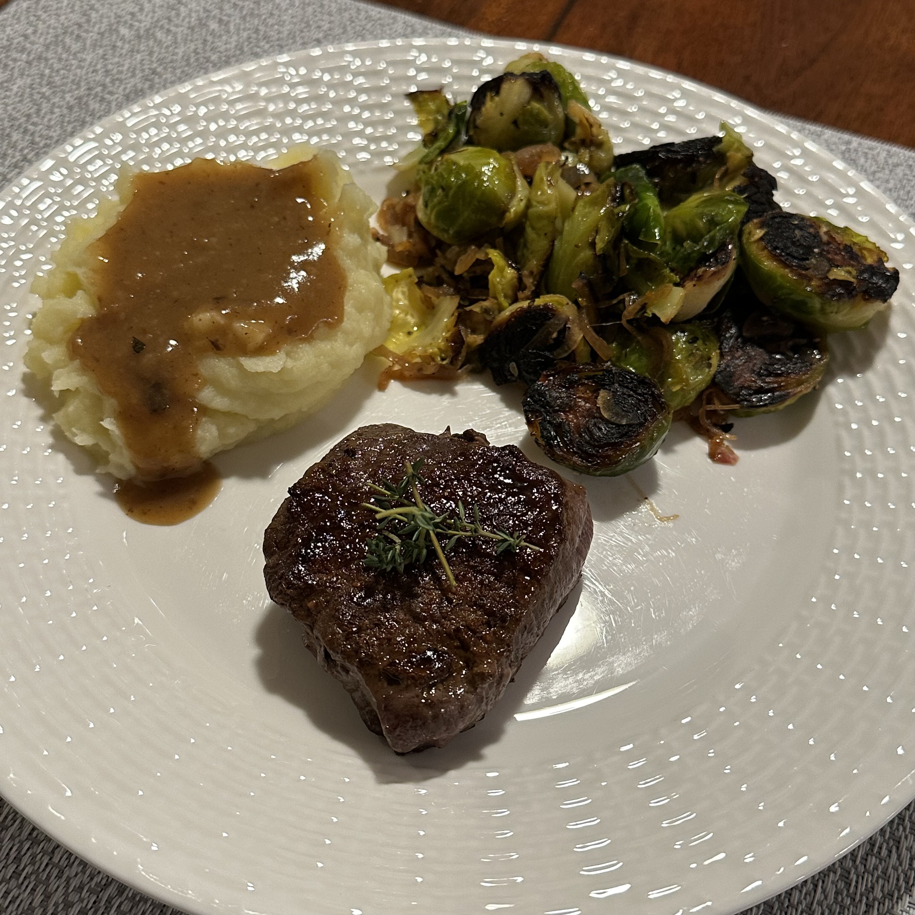 I had some elk in the freezer which I thawed out thinking I was going to make it for dinner Sunday night, but I ended up holding off until today. I did a simple pan sear and then made gravy with the drippings and some beef stock. I also made mashed potatoes and brussels sprouts. I tried adding cranberry-orange juice to the brussels, but most of it soaked into the shallots I cooked with them. They were still good. For wine we had a bottle of 2020 Boatman Ridge Zinfandel.
