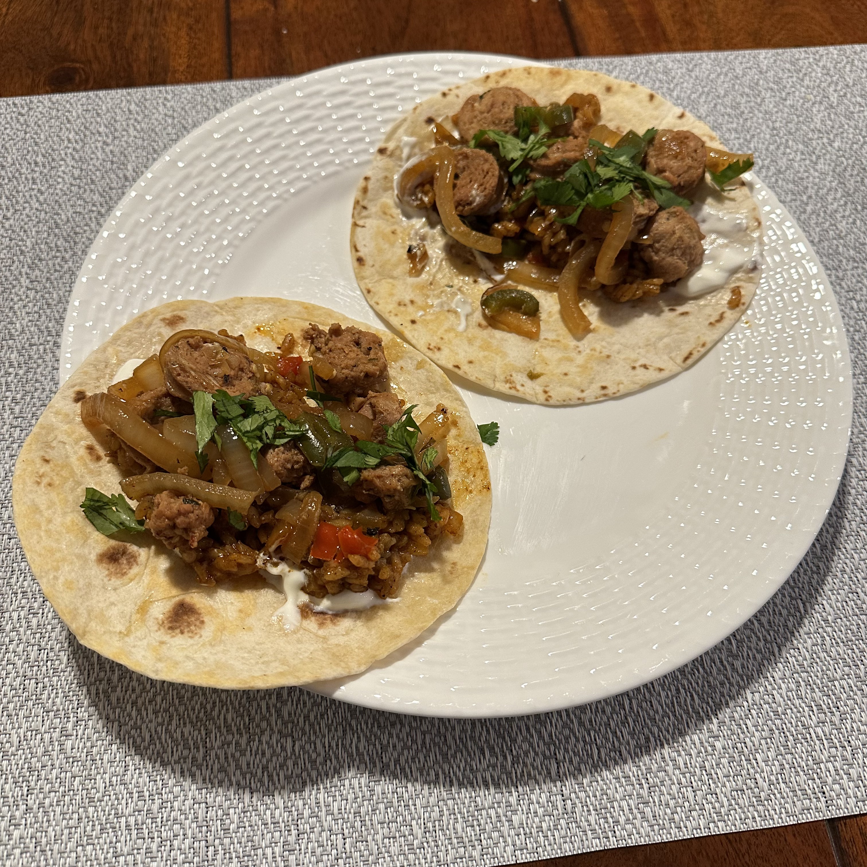 I went to Wilson Farm today to get some food to cook a real meal. Being sick I hadn’t cooked in a long time. I got sausage to make tacos and duck for Saturday night. Pig Rock makes really good chipotle-lime chicken sausage and I cooked it up with onion and jalapenos. I also made some mexican rice.