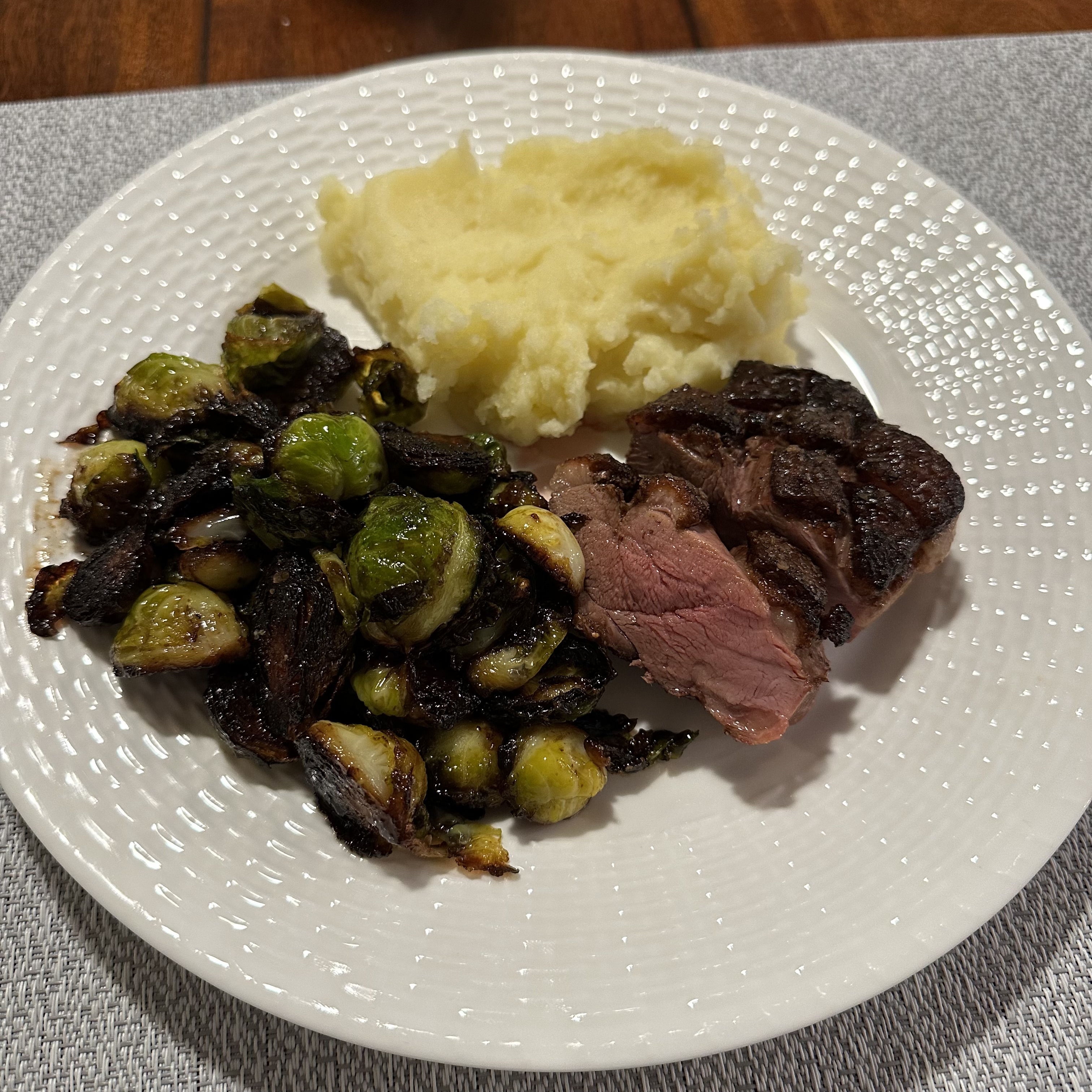 I made duck tonight. I have a very simple but effective method where I sear it skin side down for about seven minutes and then roast it in the oven for another ten, depending on the size of the duck breast. It turned out perfectly today. It usually does. I also made some mashed potatoes. But the real star of the dinner was brussels sprouts with balsamic, honey, and parmesan that I cooked in duck fat. They were amazing!