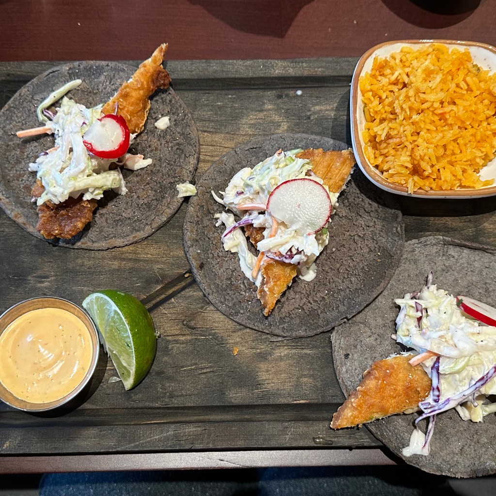 Bandoleros has a large Mexican menu featuring tacos, fajitas, and burritos, and much more. The carnitas tacos are excellent stuffed with rich, tender pork and topped minimally with fresh pico de gallo. They are served on blue corn tortillas, made fresh in house every day. Tacos come with rice or beans, but it is worth adding a side to get both.