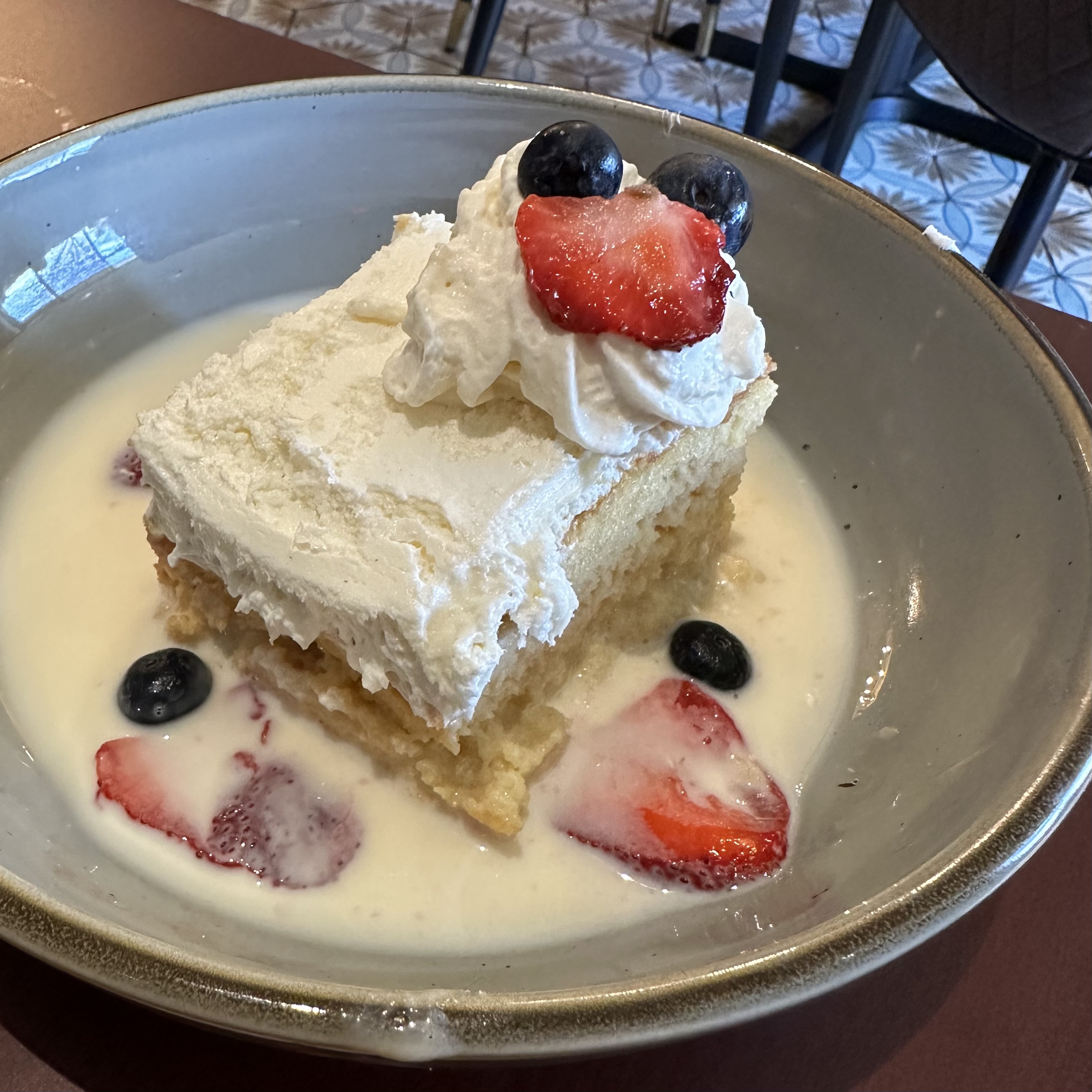 For dessert, Bandoleros offers a superb tres leches. The sponge, which is soaked in three milks, has a texture reminiscent of cornbread. It is topped with whipped cream and fresh berries and sitting in a perfect puddle of cream.