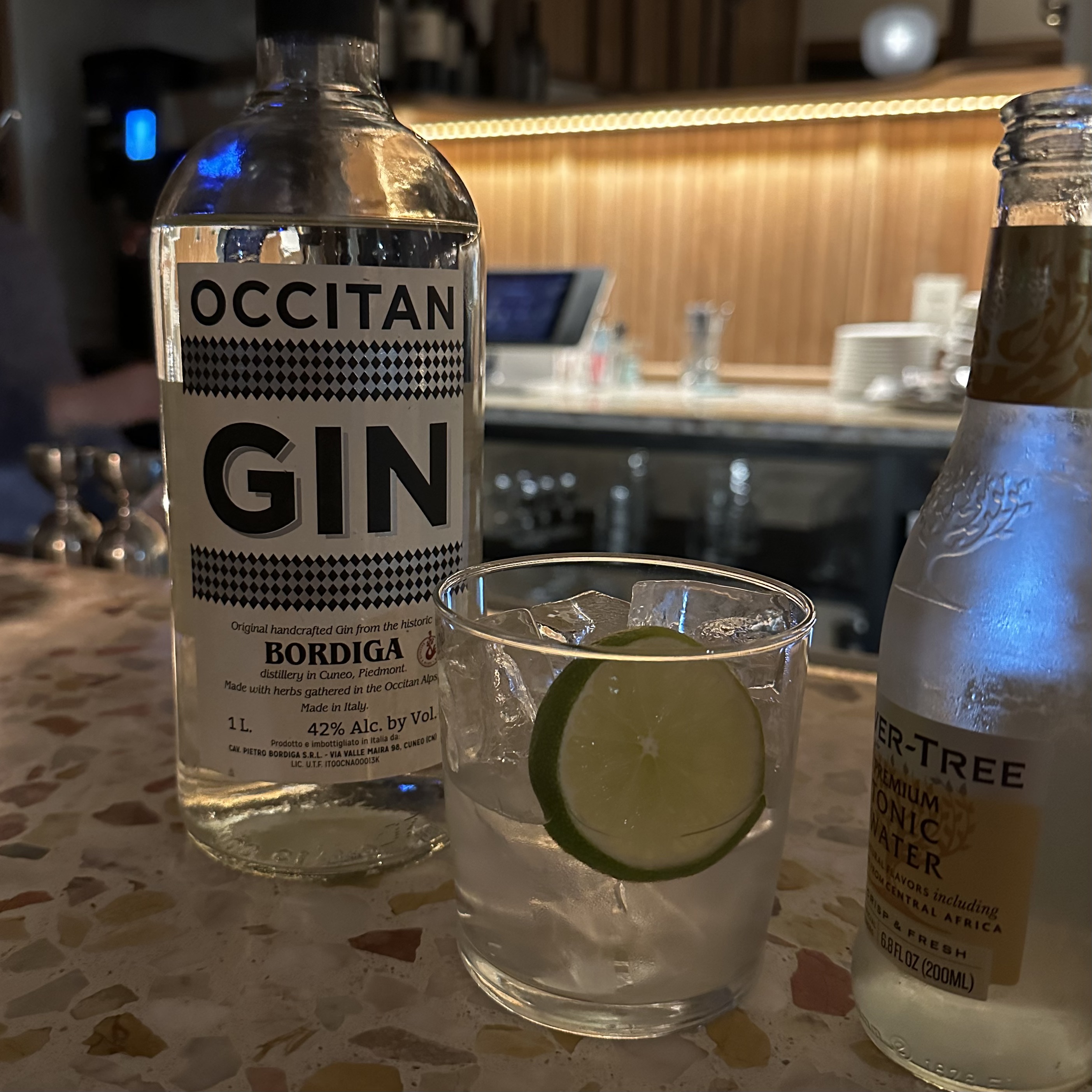 The bar is minimalist both in design and contents. There is no bottle clutter here, but carefully selected sake, wine, and spirits. Keeping with the Italian themes in the menu, Oberlin offers an gin and tonic featuring Bordiga Occitan Gin from Piedmont, Italy.