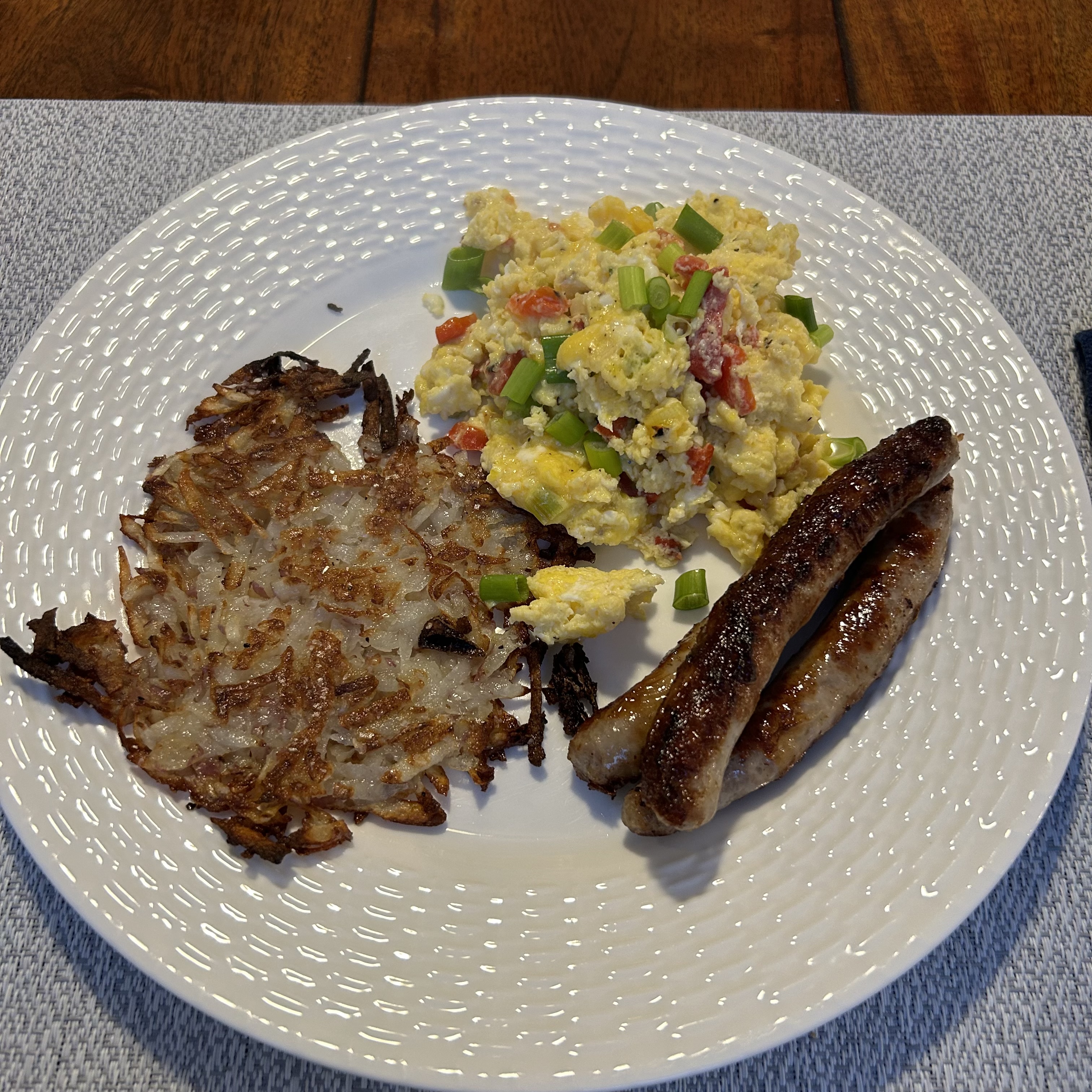 For dinner, I made the leftover sausage from Easter along with some scrambled eggs. I also shredded a potato and fried it up, but I over salted it.