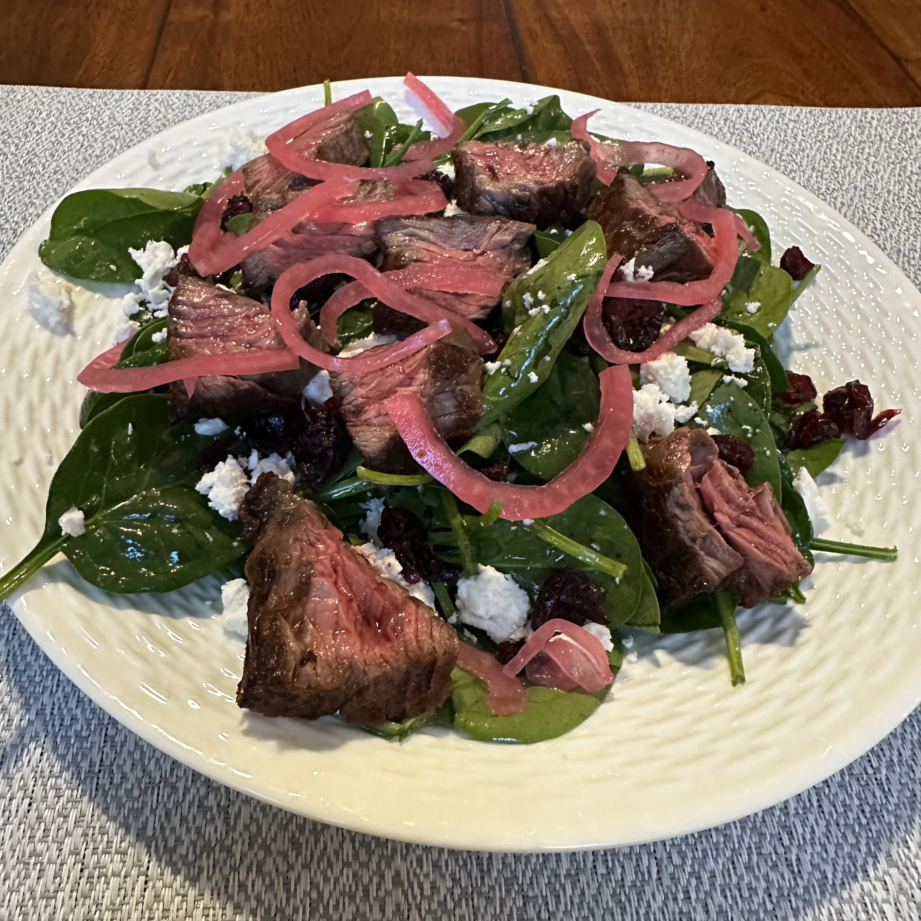 I never made the salad I intended for Easter, so tonight I made some steak and turned that into the salad I had planned to serve on Sunday. I tossed spinach in a homemade dressing and topped that with feta, cranberries, and my pickled onions.