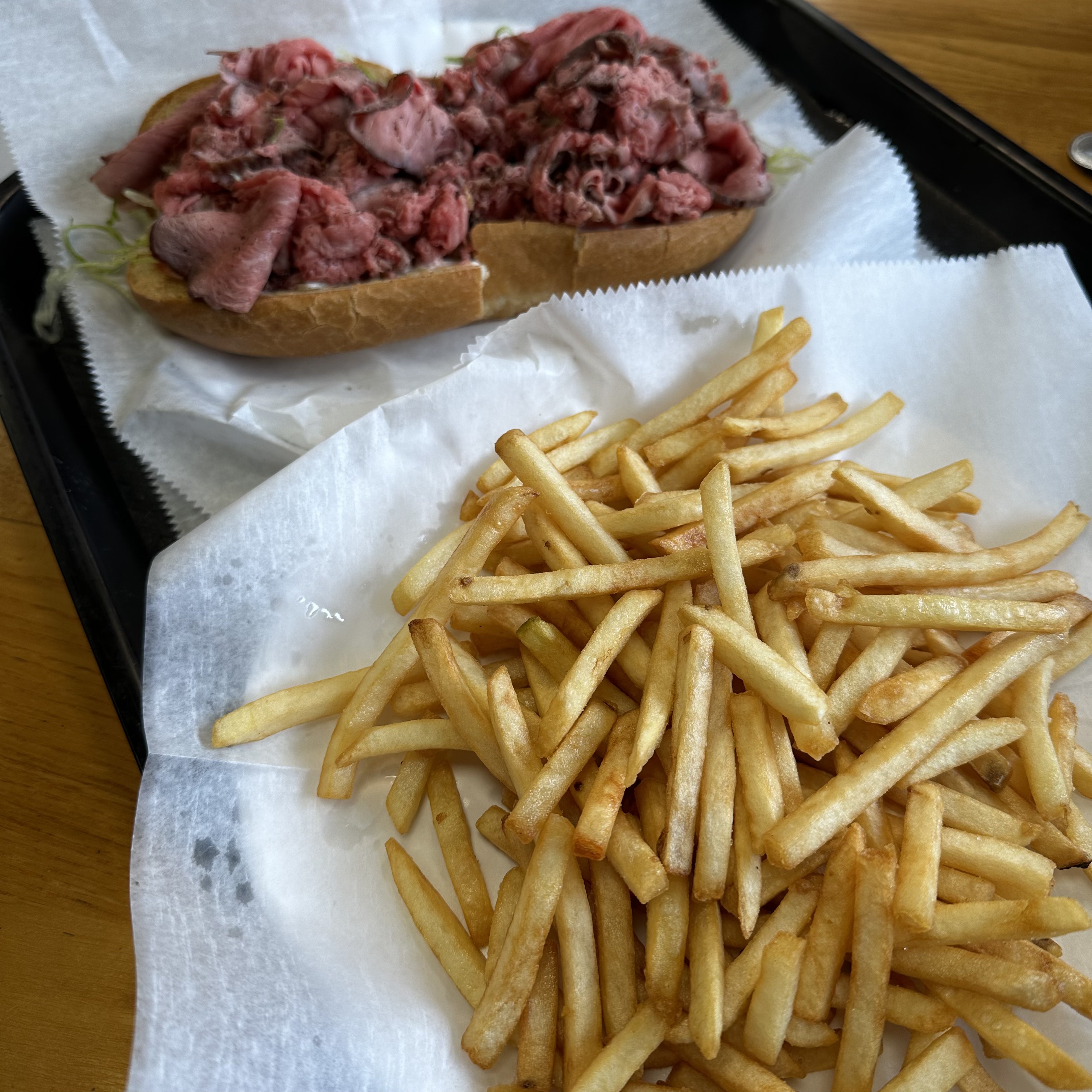 Thomas came to work with me today. The weather was too bad to walk over to DeNo’s so we drove to Brother’s instead. I had roast beef. Thomas had pizza. We shared some french fries.