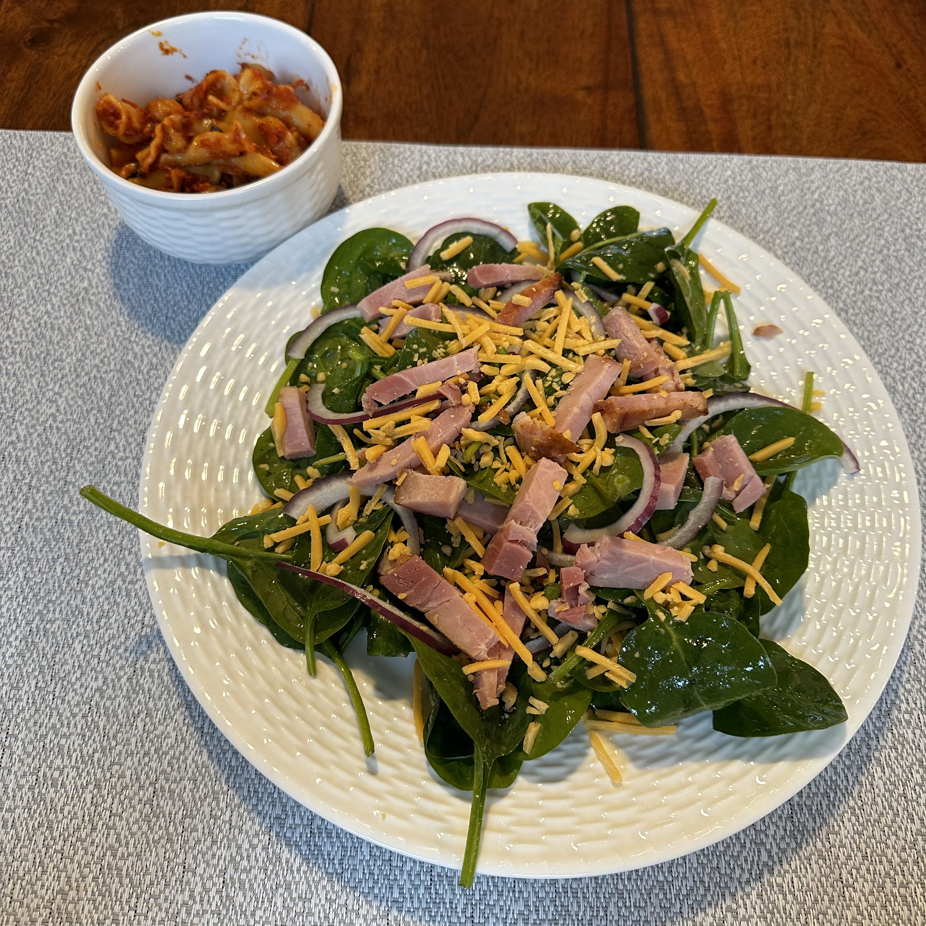I’ve been eating too much and need to scale back. Tonight I made a nice salad with spinach, ham, red onion, and cheddar. I also had a little leftover pasta from Kelly’s dinner while I was away. The salad was damn good, but I’m still hungry.