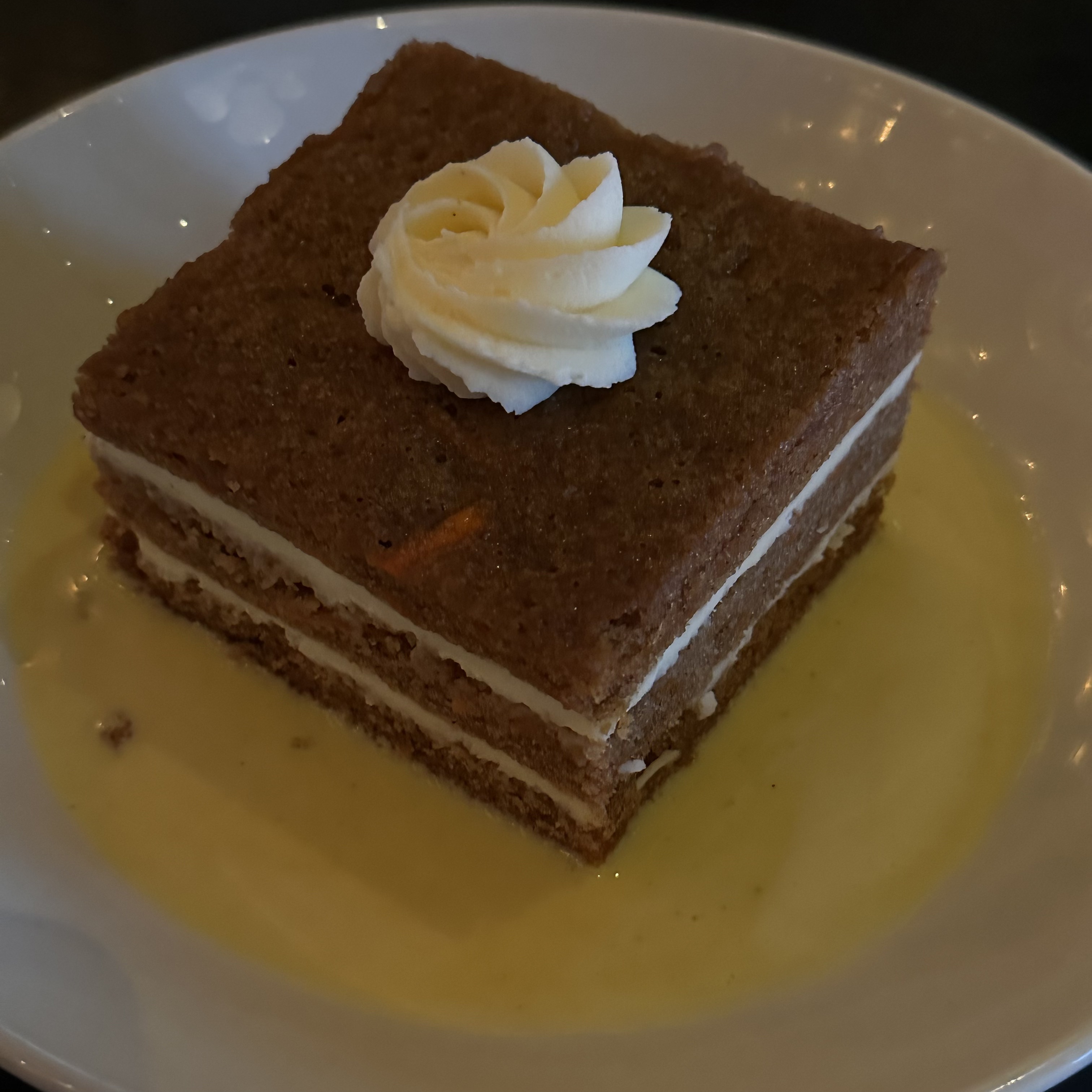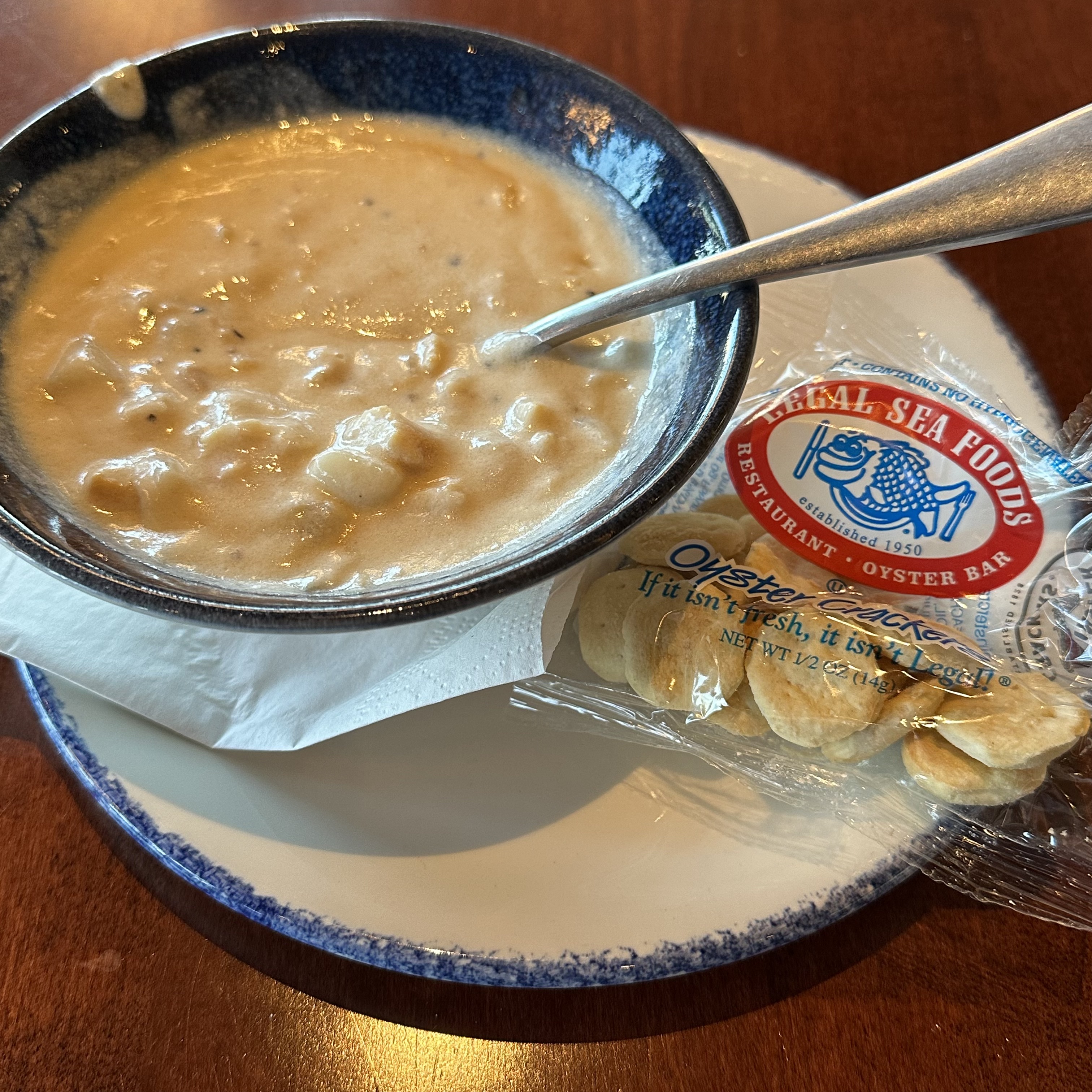 Today was the start of vacation week and the start of a new food project. I’m on a quest to find great clam chowders around New England. We went to dinner at Row 34 and I taste tested my first chowder. I also got some shrimp and french fries. For dessert we had carrot cake. It was good but heavy on the ginger for my taste. I also would have liked more cream cheese frosting.