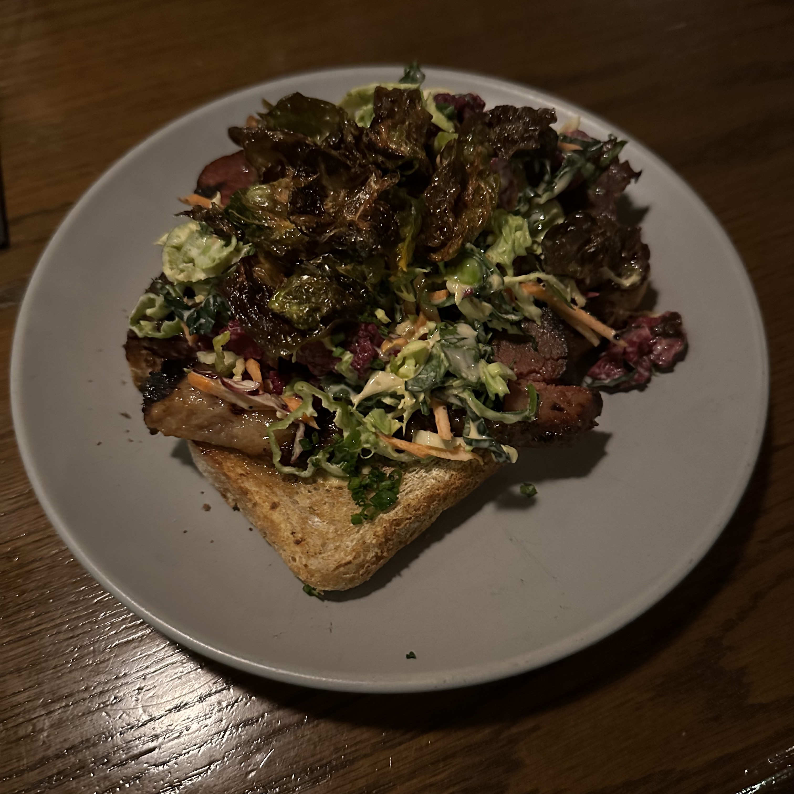 I went out with my college roommate tonight. We stopped by Grendel’s Den and I got the pastrami toast which is topped with brussels sprouts. It was excellent and I’d go back just to get that again. After that we went to The Longfellow Bar where I got steak tartare.