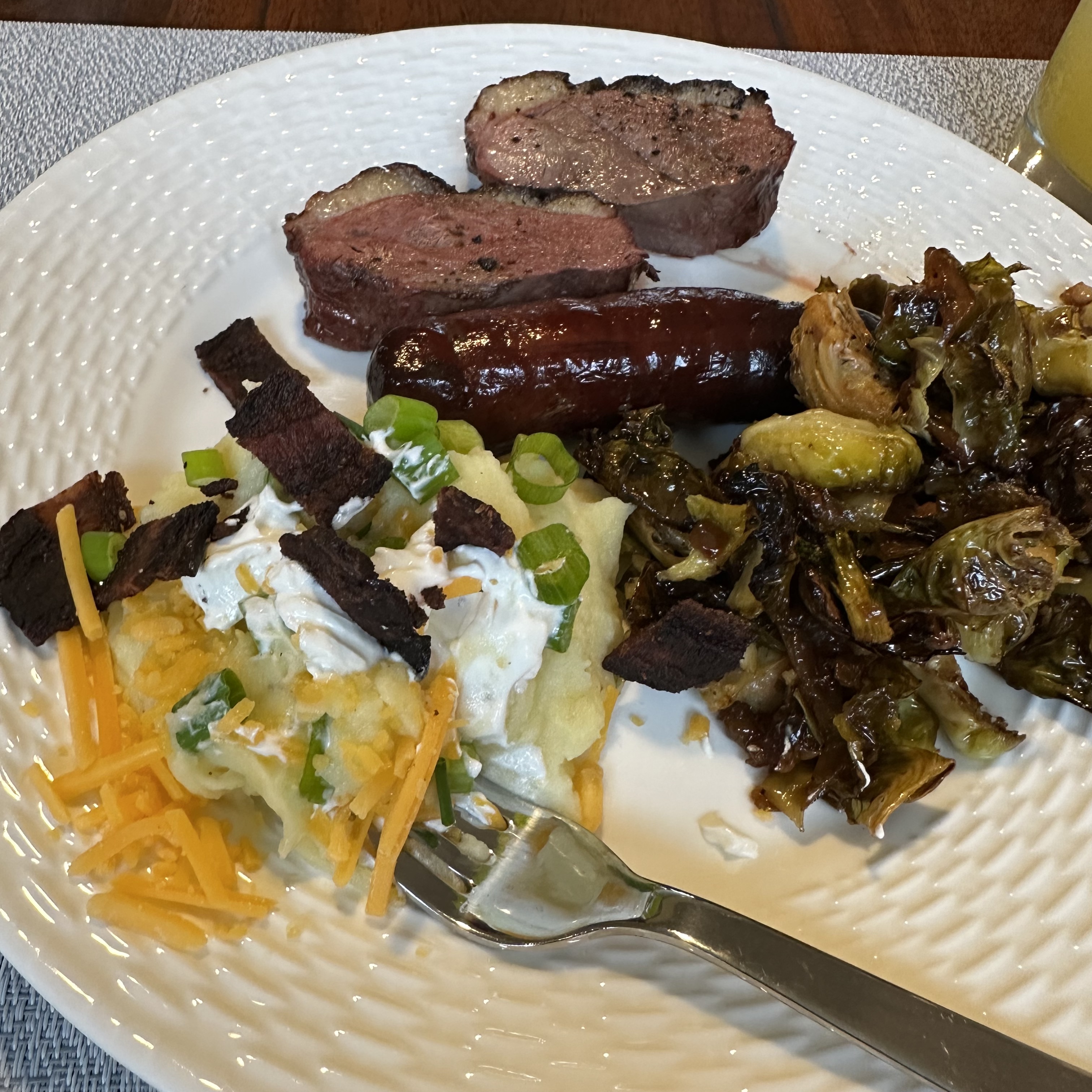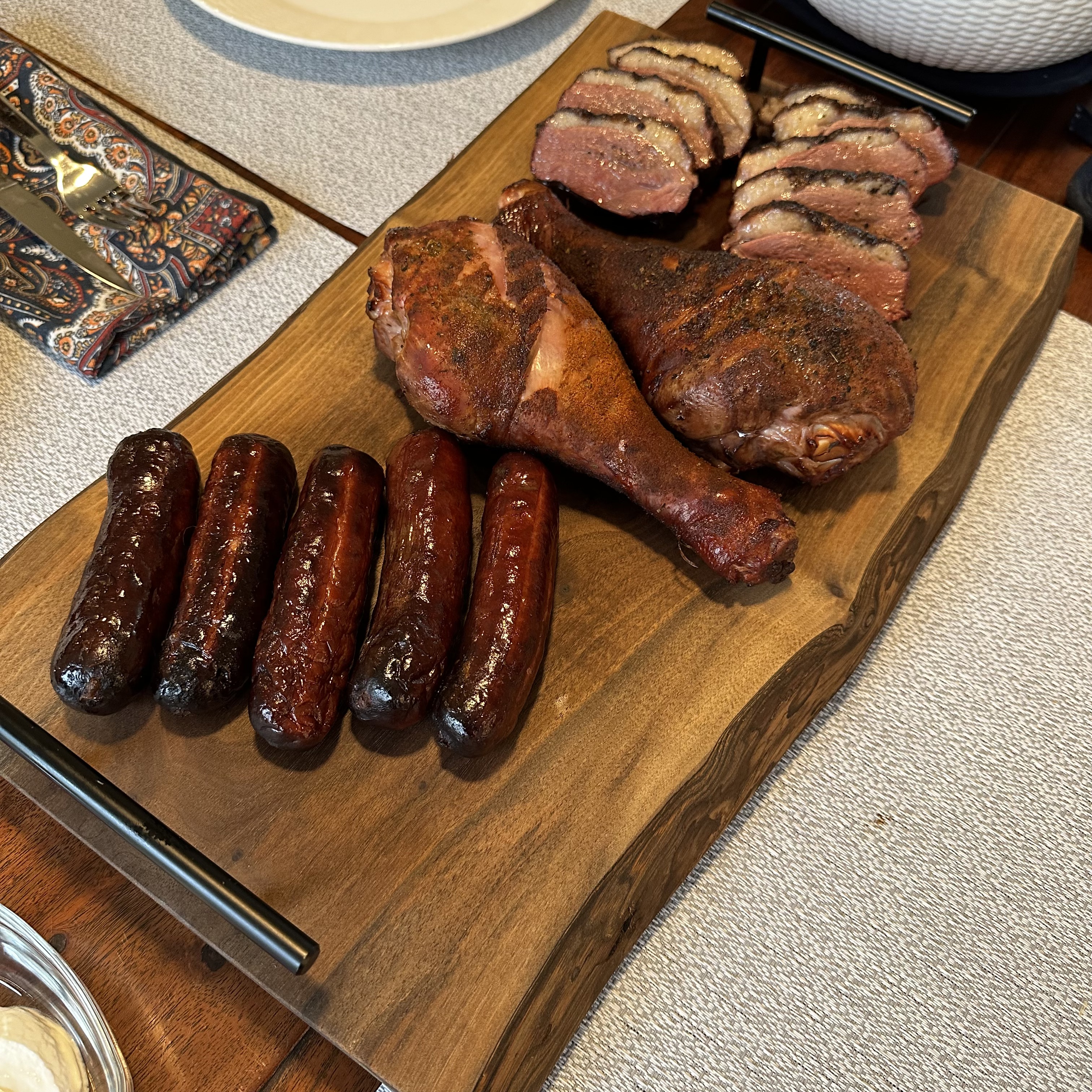 Niki and Sreyleak came into town and to dinner. I asked what they would like and they requested bbq. I smoked a duck breast, Pig Rock bratwurst, and turkey legs. I also made oven roasted brussels sprouts and loaded mashed potatoes. We also had shrimp cocktail and whoopie pies. It was a fun evening with very good food.