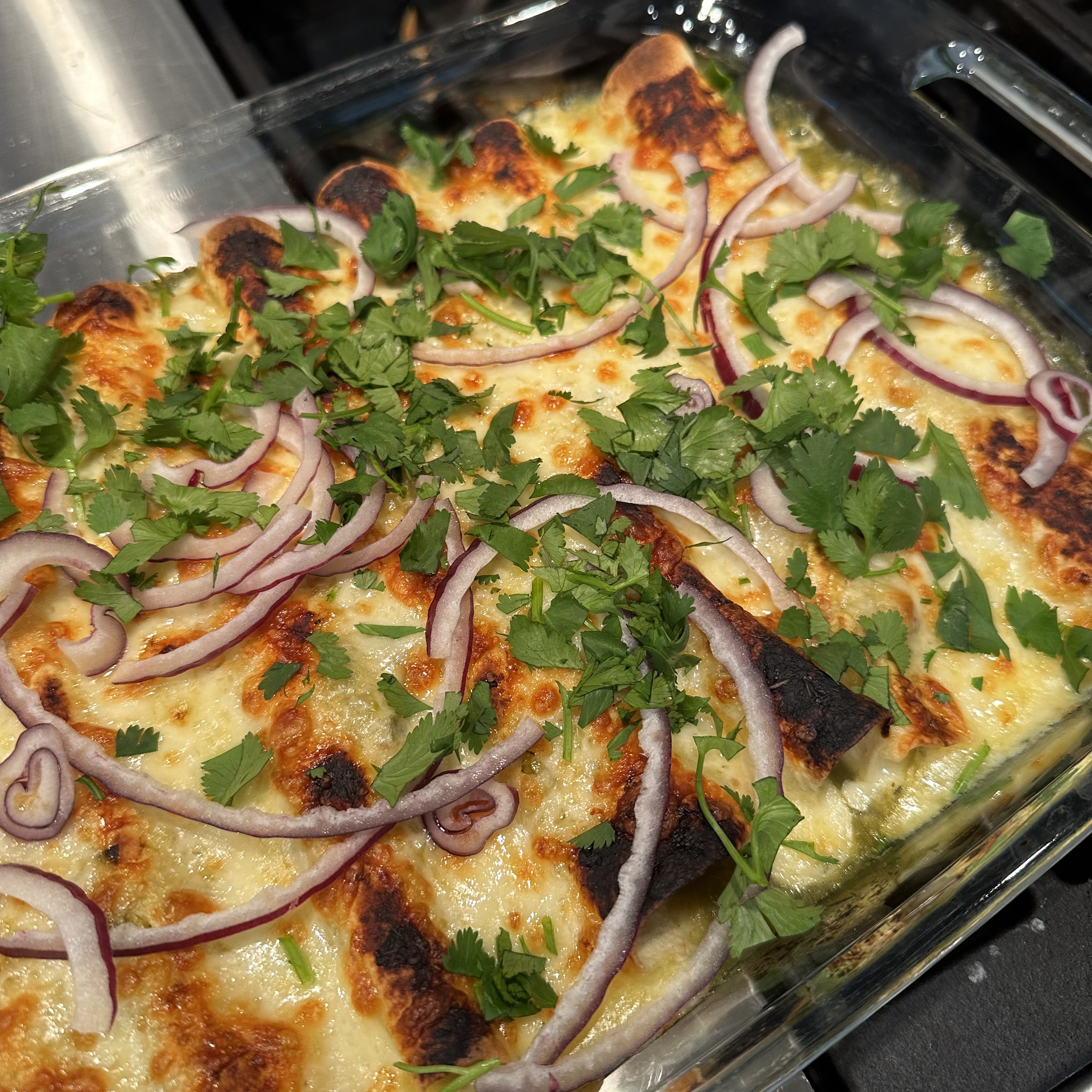 Happy Cinco de Mayo. We had company who likes enchiladas so that’s what I made. I filled them with my green chili chicken and topped them with a green tomatillo sauce and jack cheese. I also made mexican rice and Georgina made a corn salad and margarita cheese cake for dessert. Of course there were margaritas and palomas and even a little high end tequila to sip with dessert.