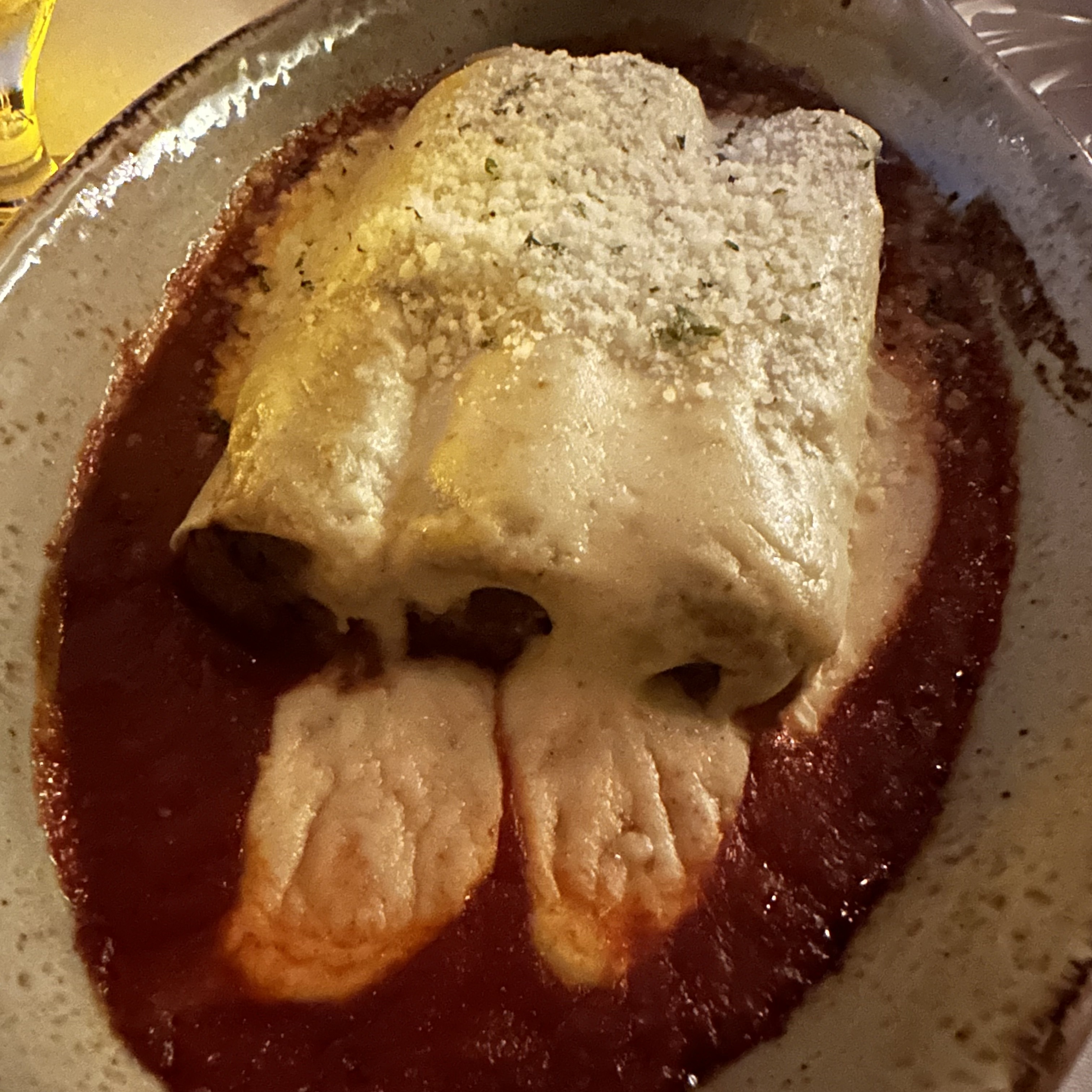 I went to St. Louis for my brother’s wedding this weekend. But tonight, I took mom out for a little early Mothers Day celebration at Charlie Gitto’s. We shared everything starting with toasted ravioli. Unlike most toasted ravioli, this has no edges. It’s just little pillows stuffed with beef, pork, and veal. Next we had caesar salad. And last we had cannelloni. They also gave us a free slice of cake to celebrate. We had a great time.