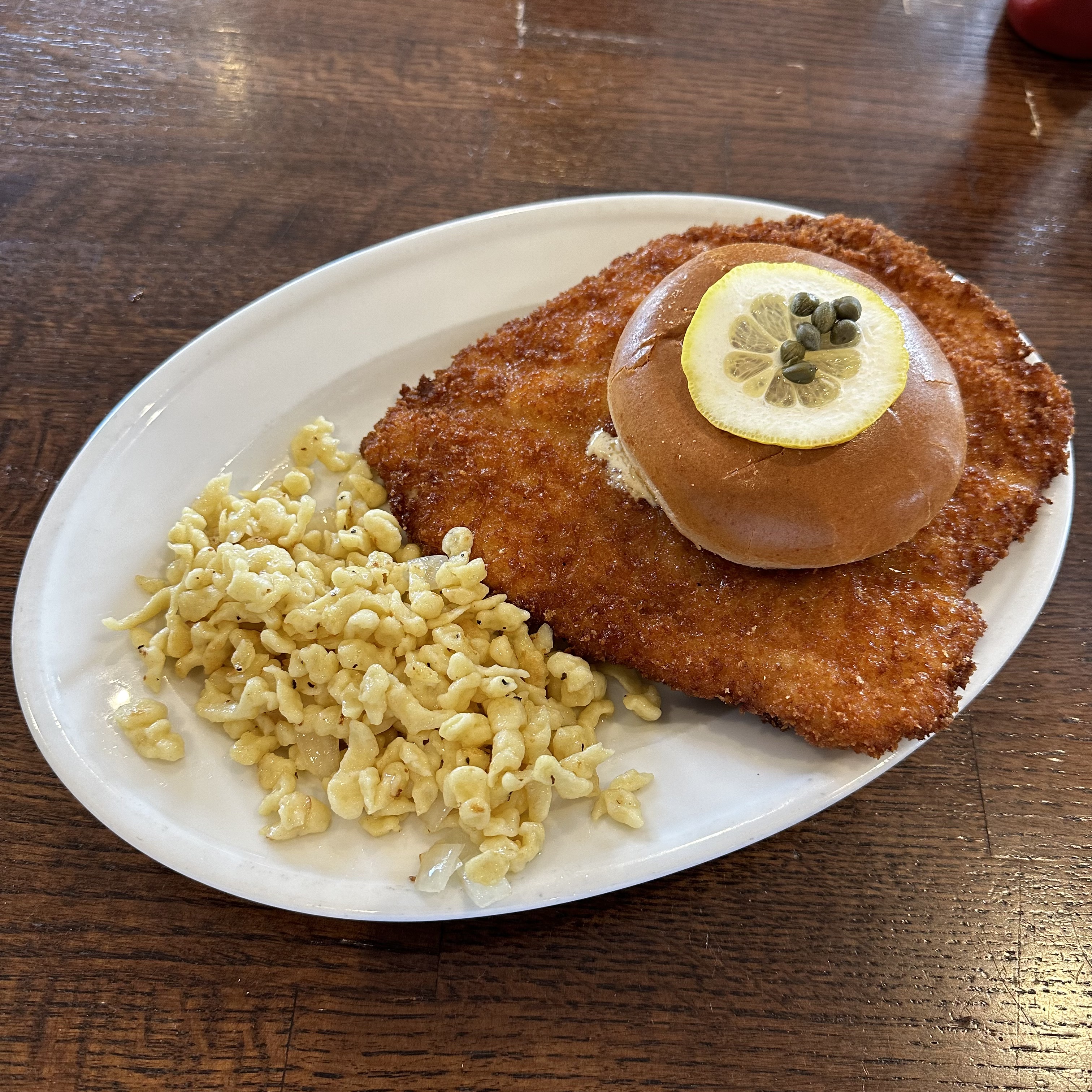 I had a very busy day so I started it out right with a danish from Bello’s Bakery. After that I drove down to see my dad’s house in Ste. Genevive, MO. We walked around the town, which was really enjoyable and had lunch at Audubon’s. I got a schnitzel sandwich with spaetzle. It was excellent, but it did say it came with red cabbage and it didn’t. That was a bit of a disappointment. I love cabbage.