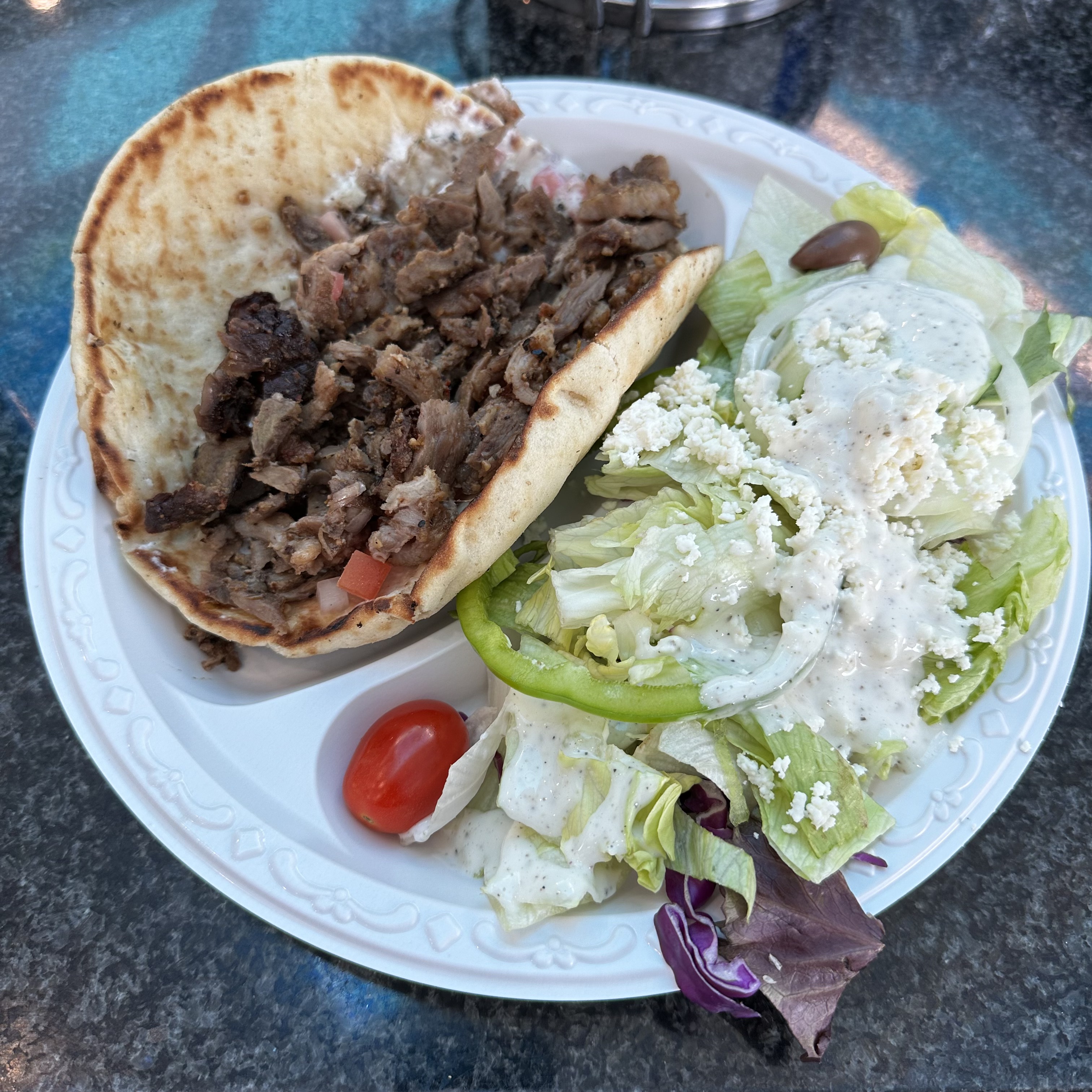 I had a very late lunch today at Farm Grill & Rotisserie in Newton. I got the lunch gyro which came with a Greek salad. It is a blend of beef and pork on a very good pita. I would have liked more vegetables on it, but I just scooped up some salad and tossed it on top. I would get it again.