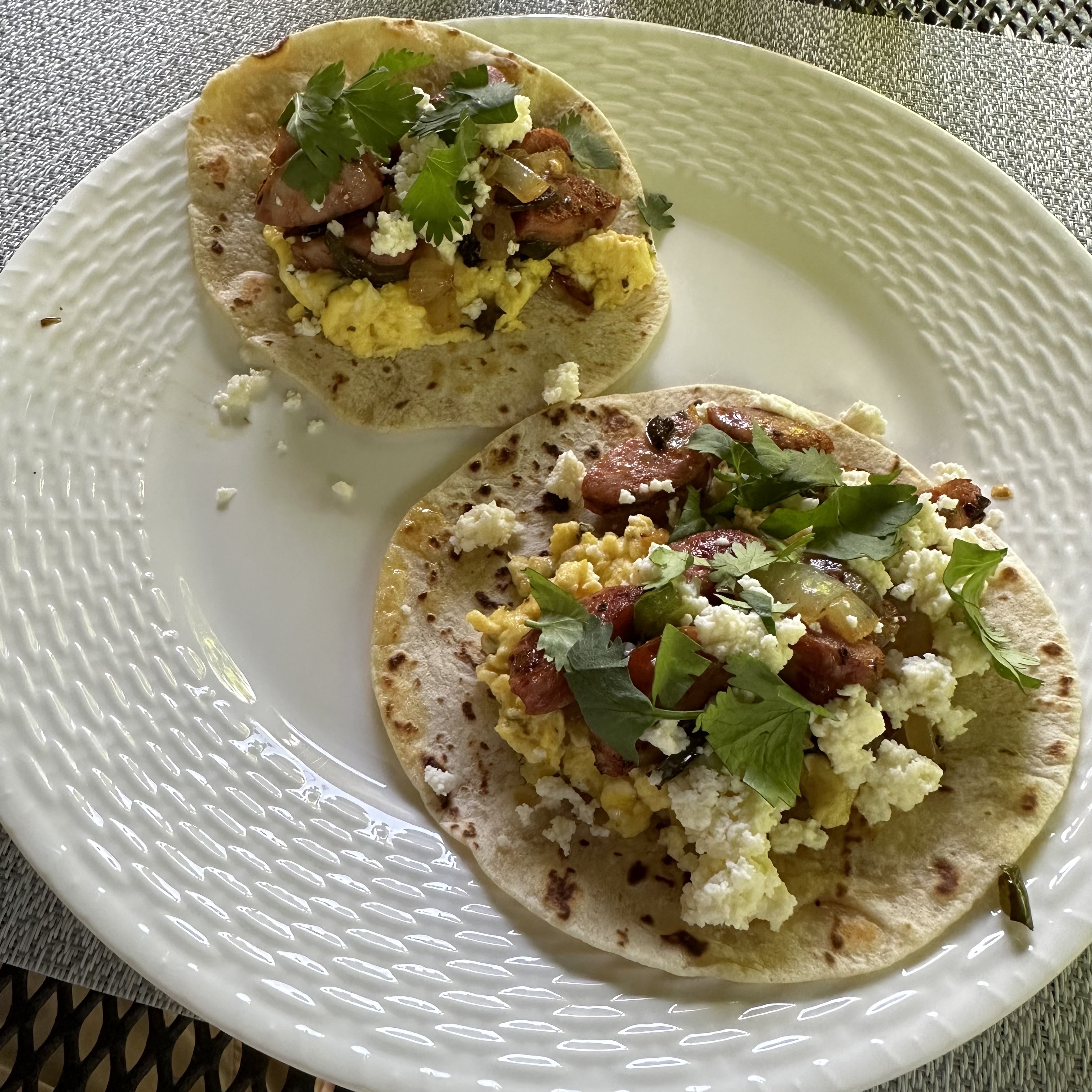 I really don’t try to make tacos on Tuesdays but when you make tacos a lot it’s bound to happen. Tonight I made breakfast tacos with eggs, chorizo, jalapenos, and queso fresco.