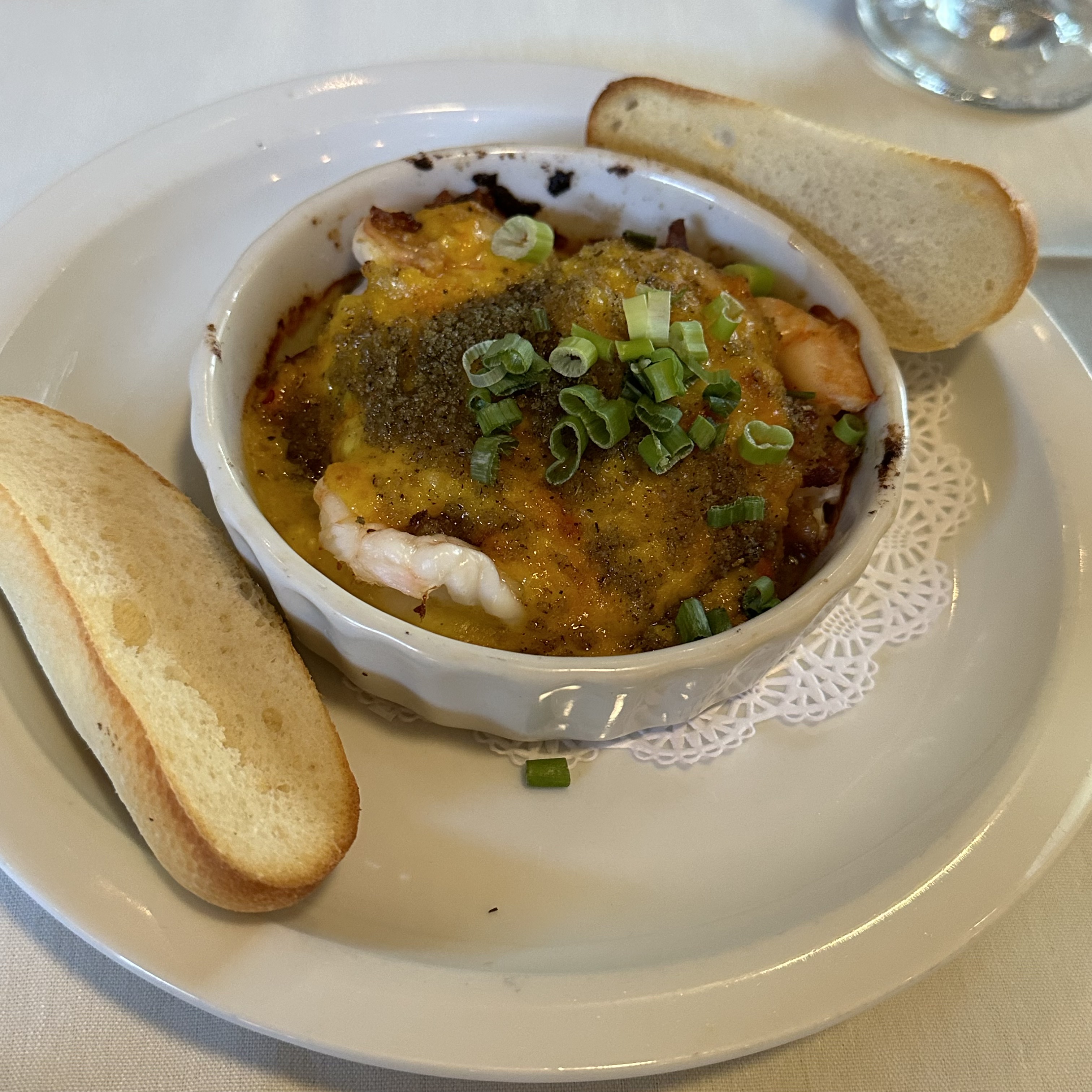 For appetizers, there are German offerings like Potato Pancakes and Bratwurst, but also Escargot a la Bourguignonne, Scallops Florentine, and Seafood Mornay. Desserts come from The French Bakery with the exception of the house made apple strudel.
