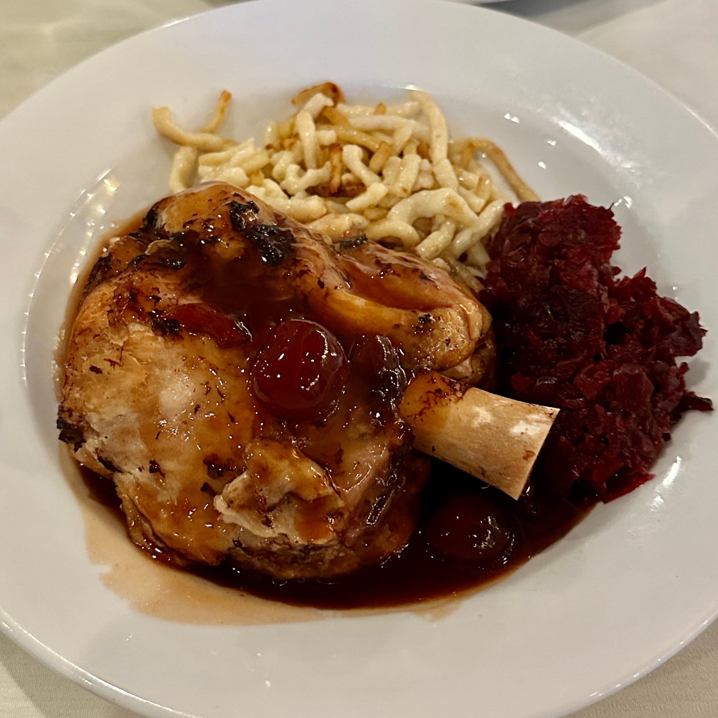 Not always on the menu, but often a special is their famous Schwienhaxen. Like the mixed platter, it is a very large serving. Slow-braised pork shank, so succulent and tender, is topped with a cherry reduction and served alongside spaetzle and red cabbage.