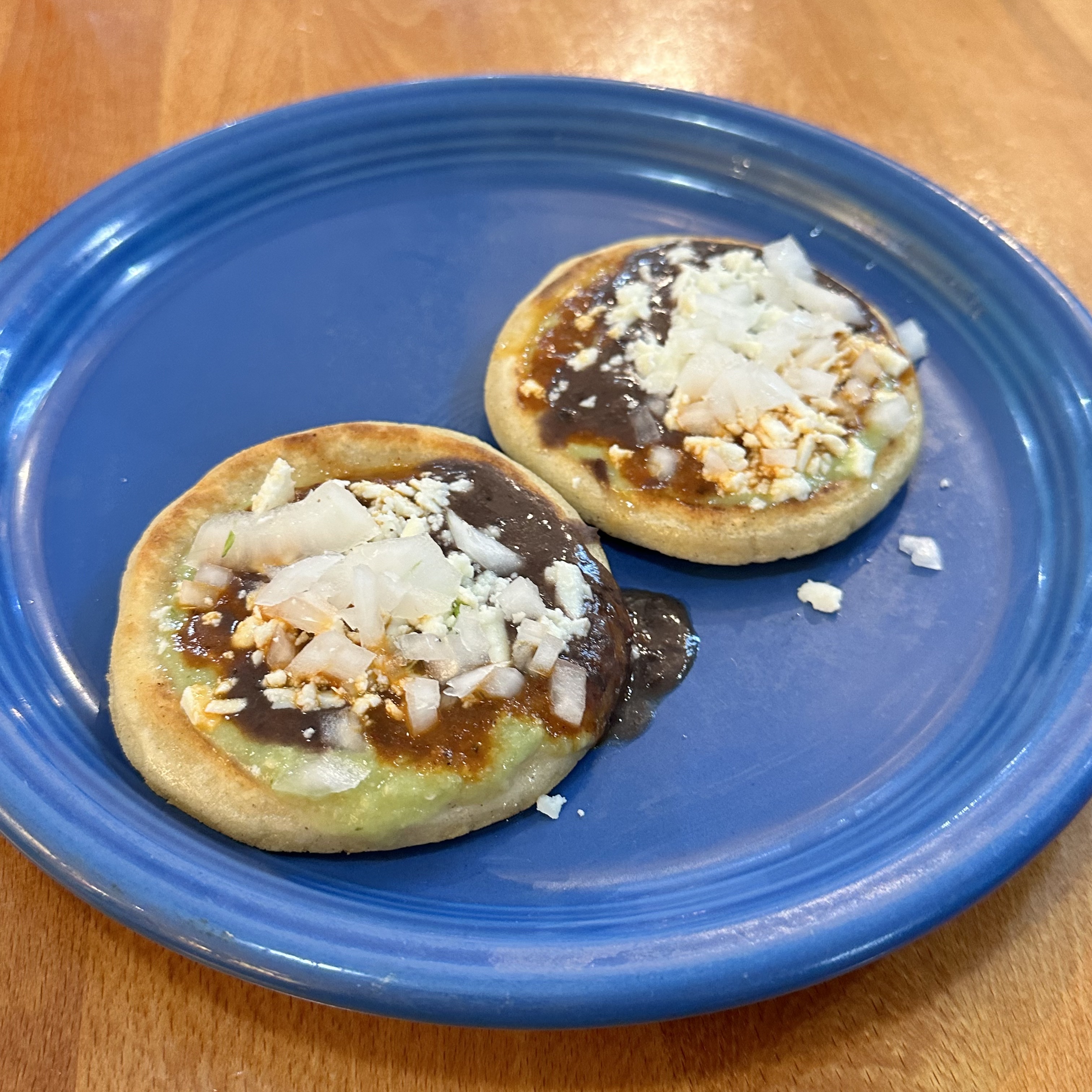 two fried corn tortillas topped with pureed black beans,