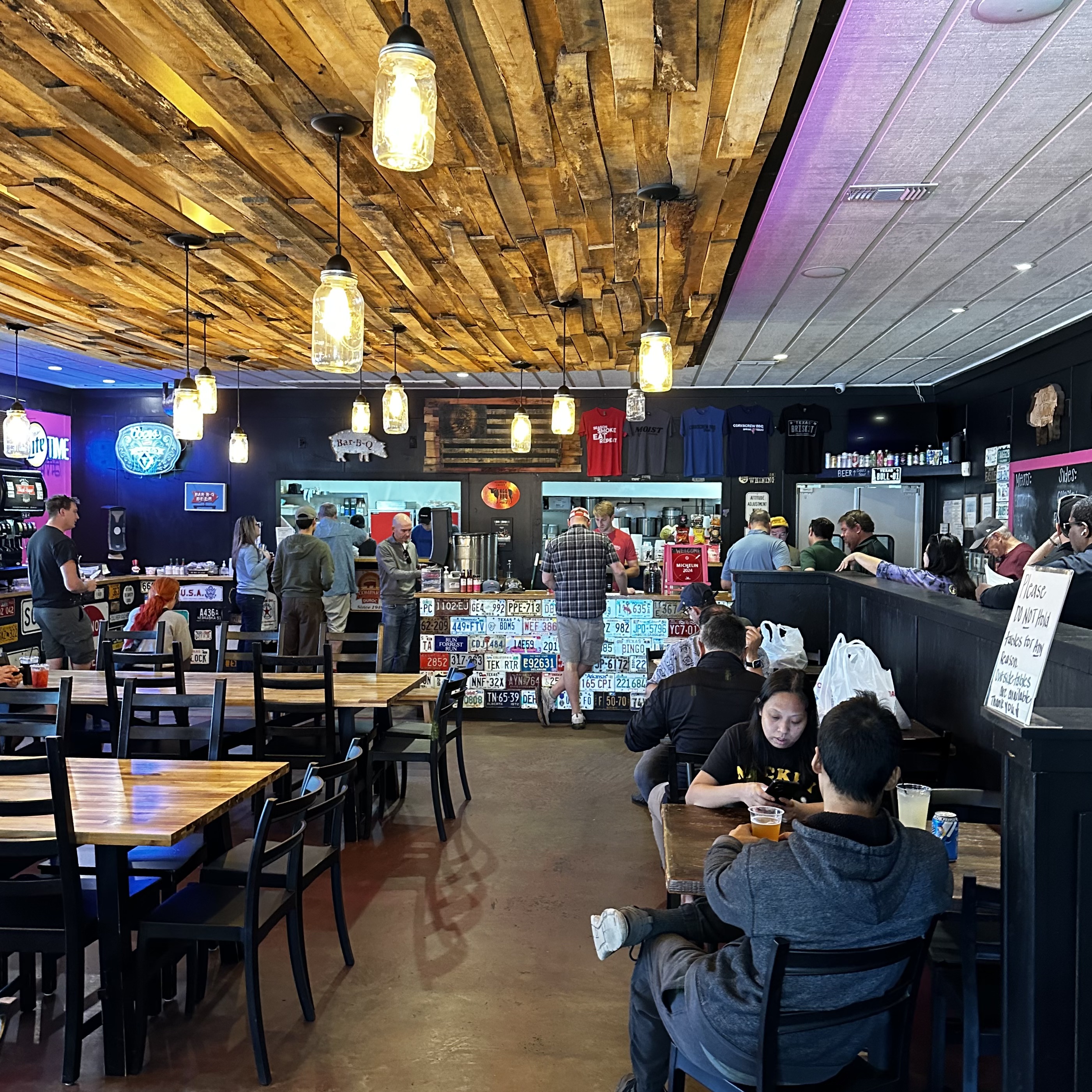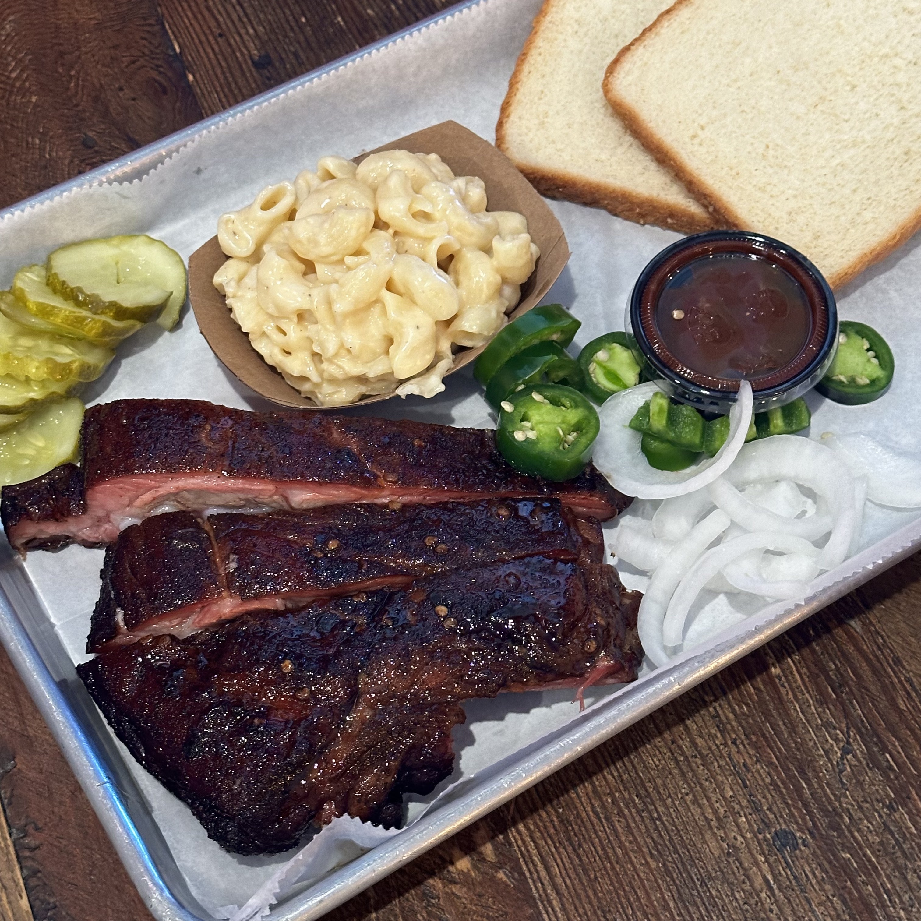 Meat and plates are served with pickles, onions, jalapeรฑos, bread, and sauce, but there are several unconventional menu items to try including house tacos with cabbage, green chile ranch, fresh pico and choice of meat. The Whole Hog sandwich is 1/4 lb pulled pork, 1/4 lb link sausage, and 1 fat rib on a bun. Or try the Stuffed Potato Salad which tops warm potato salad with queso, green onions, and a choice of meat along with a side of their green chile ranch.