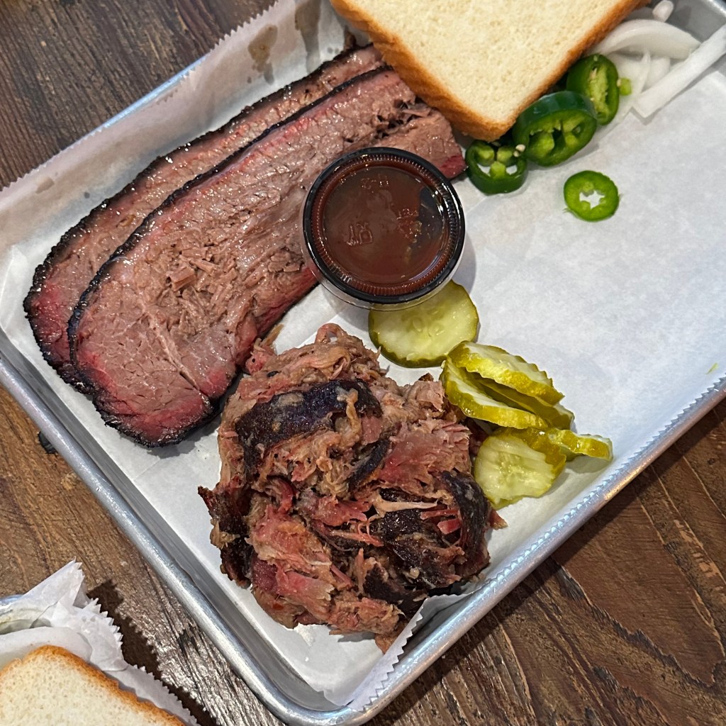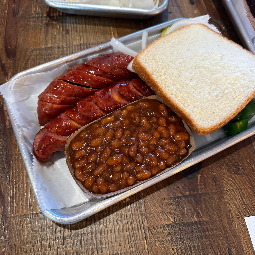 There is only one thing that must be ordered, moist brisket. It is absolutely perfect with rich flavor and a beautiful smoke ring. Their beef is sourced from Creekstone Farms which provides Corkscrew with Prime brisket. Ribs are outstanding, pulling away from the bone with just a slight tug. The jalapeรฑo-cheese sausage is stuffed with cheese and the pulled pork is delicious with a vinegar-based bbq sauce. For dessert, there’s cobbler of the day which might be as essential as the brisket.