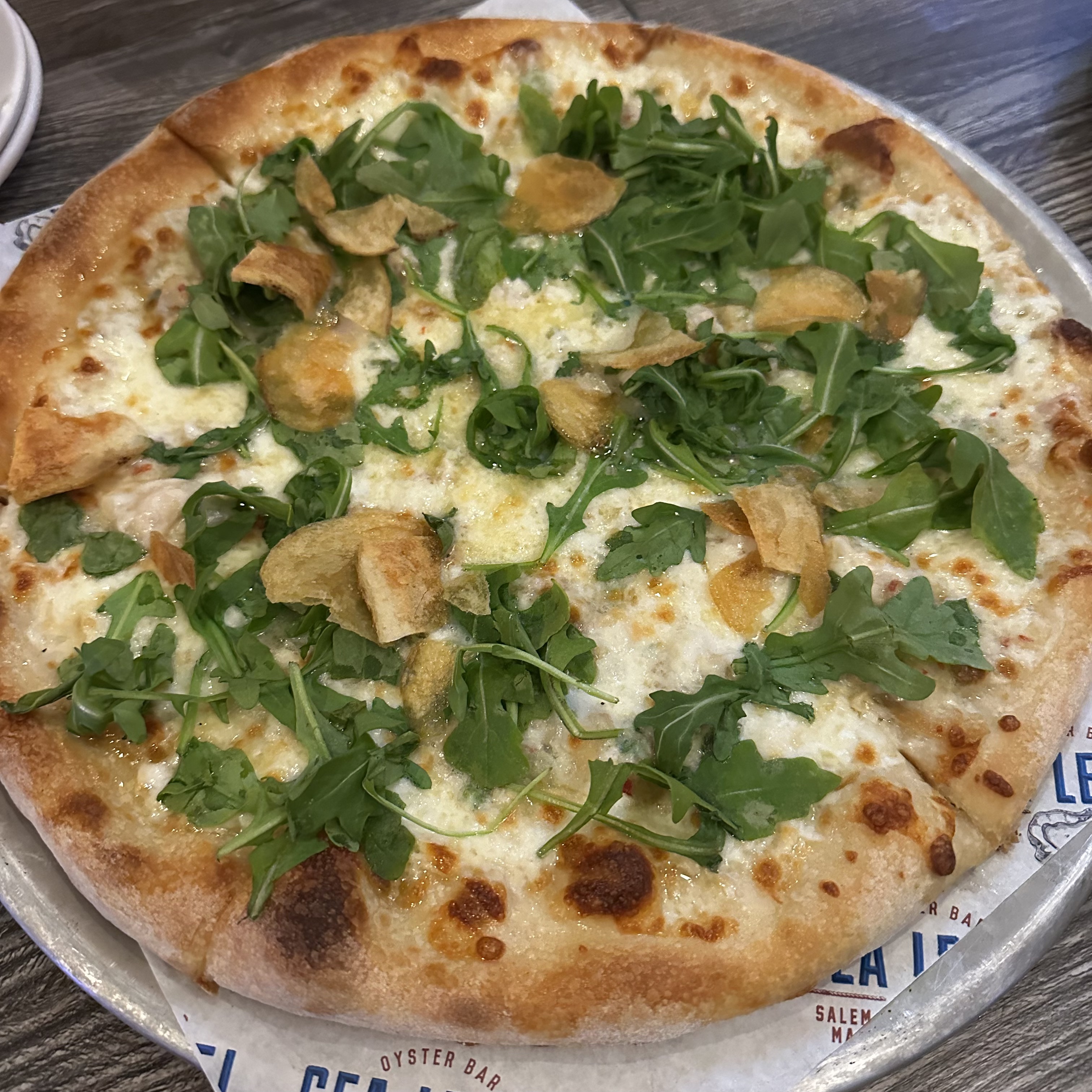 We had to go to Newburyport tonight and stopped at Sea Level Oyster Bar. We started with a cup of their chowder, which was good. Then we got the white clam pizza and a crab cake. The food was solid over all but not good enough to go back for.