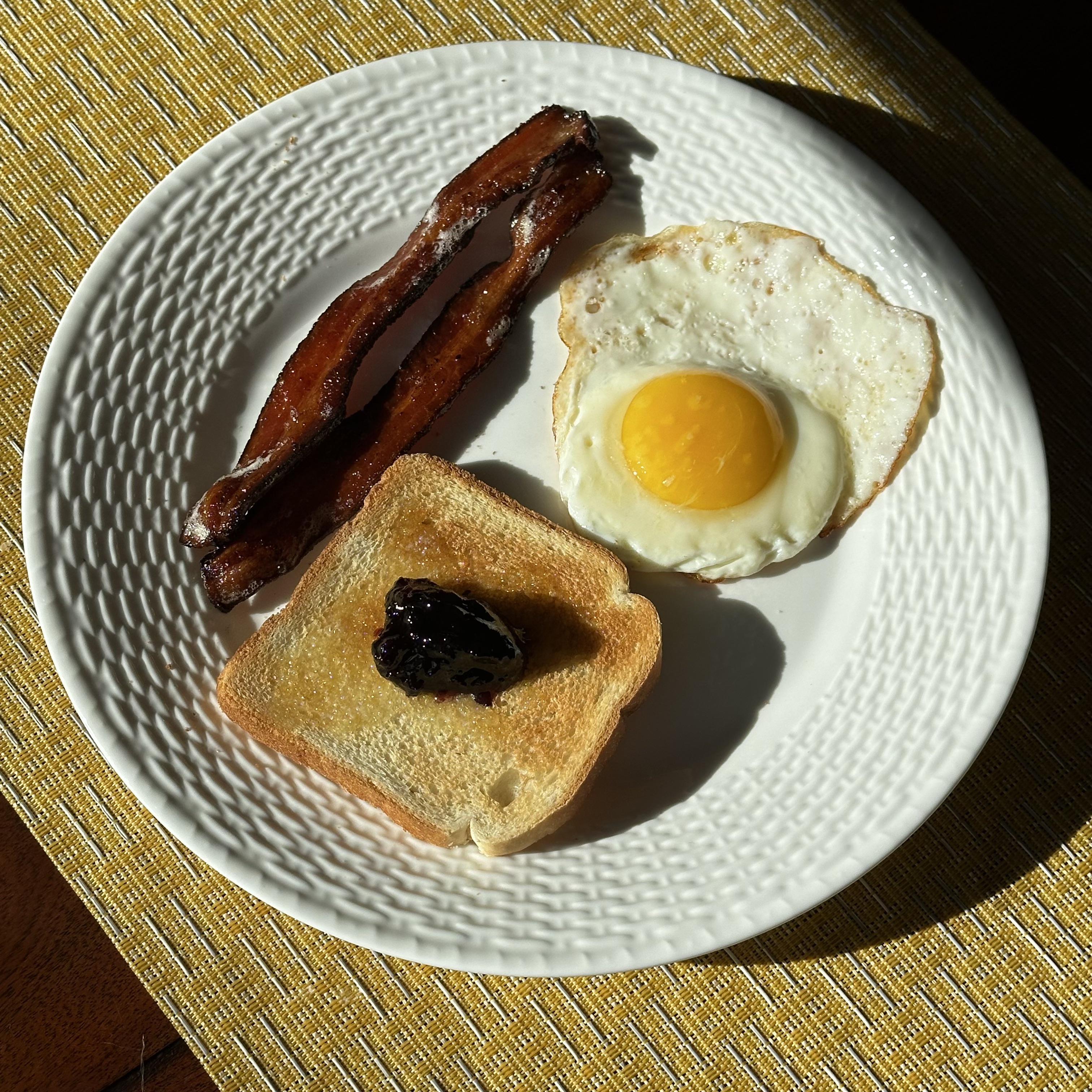 I made Kelly breakfast this morning: bacon, fried egg, toast with blueberry jam. For dinner I made a soup with butternut squash, celeriac, leek, carrot, and sage. I garnished it with bacon and scallions.