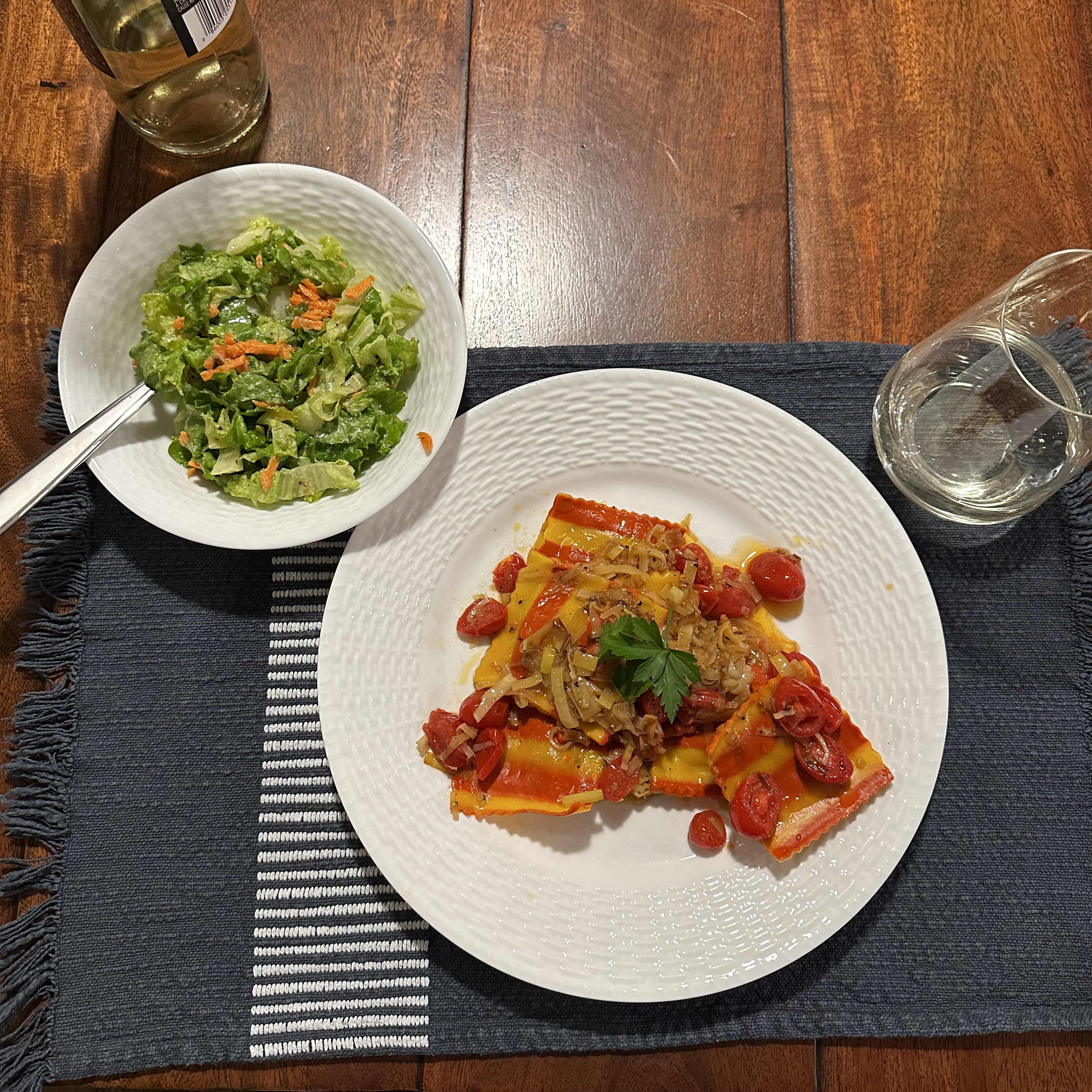 I made a tomato-leek sauce for a crab and lobster ravioli that I picked up at Whole Foods and a simple salad.