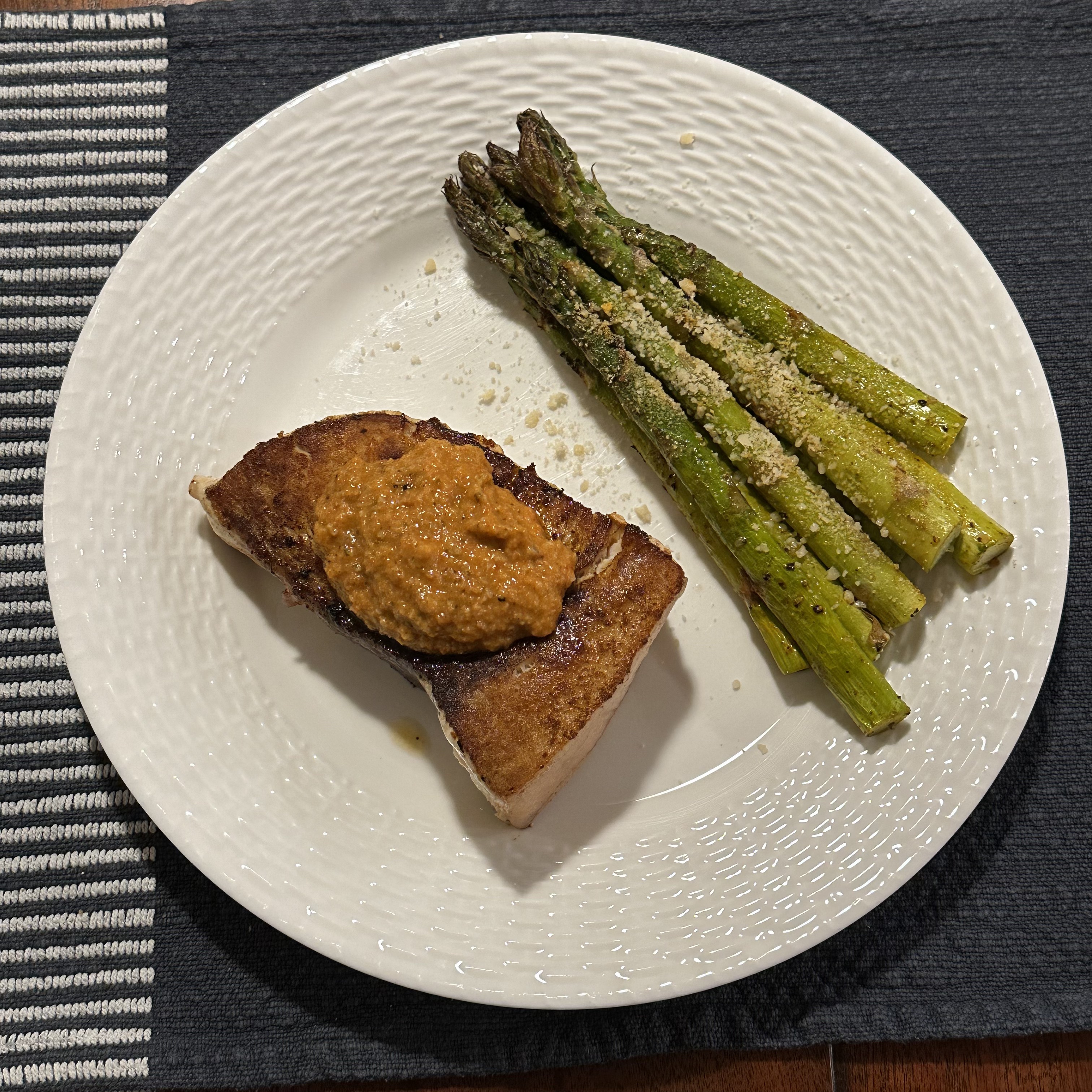 Dinner: Swordfish, reversed seared, with romesco sauce and a side of asparagus.