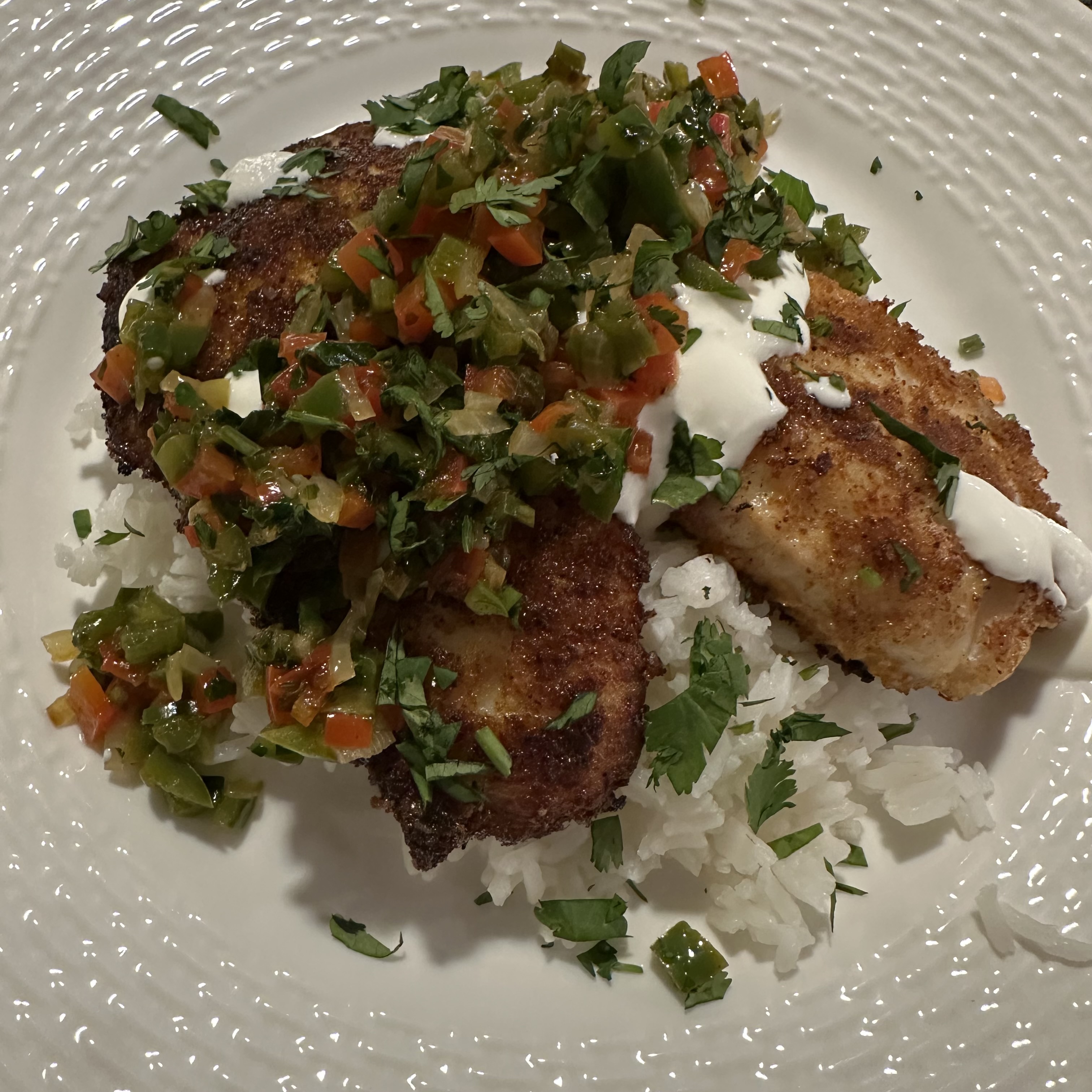 I haven’t cooked much so far this month. I did make a pot of chicken noodle soup which we ate for several days, but here is the first real dinner I made. It is fried tilapia with chili powder bread crumbs, topped with jalapeno-red pepper relish, lime crema, and cilantro, served over white rice. It was excellent.