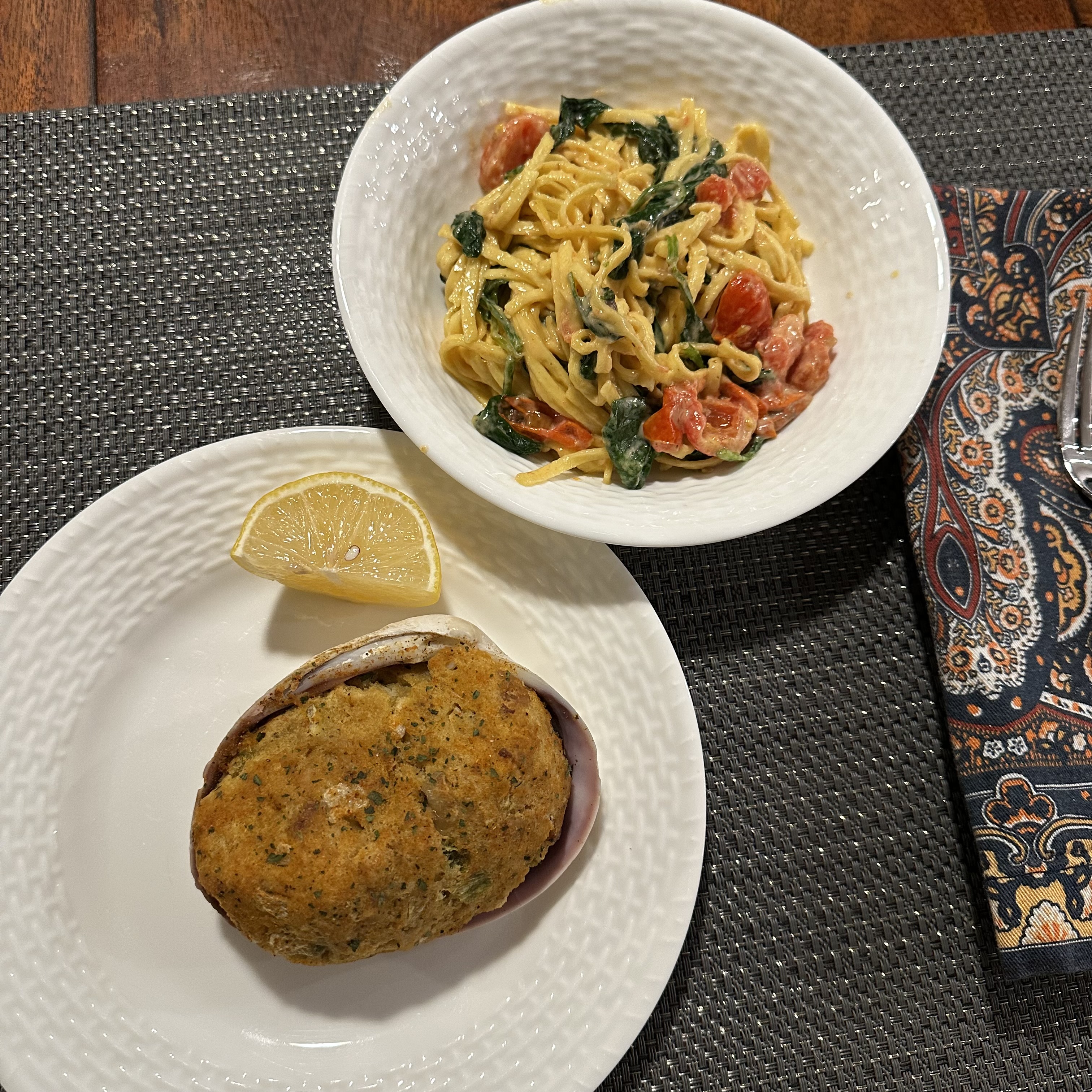 My wife made me dinner tonight because work was a little rough today. She got some stuffed clams which were a little bready and some creamy pasta with garlic, tomato, and spinach.