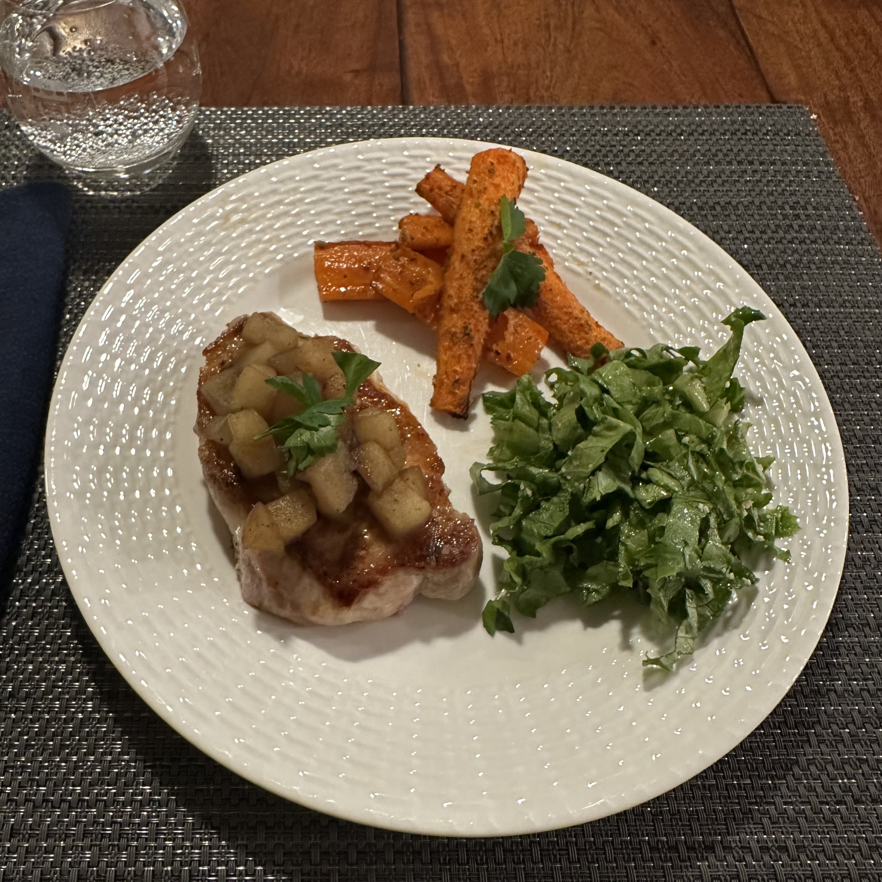 I really enjoyed dinner tonight. I made pork chops seasoned with some smoked paprika from my favorite spice shop in Portland, ME. I topped them with sweet and sour clove-spiced apples. Along side that I made a simple salad and roasted carrots seasoned with garlic powder, Mexican oregano, and some Guatemalan pepper powder.