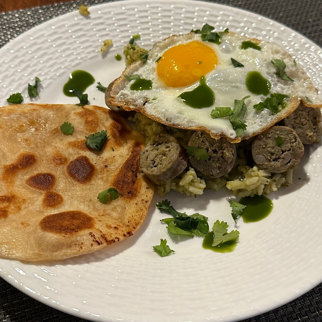 I picked up chorizo verde sausage at Formaggio Kitchen on Friday. I served them sliced over rice verde made with garlic, onion, poblano, jalapeno, and cilantro. Then I topped it with a fried egg.