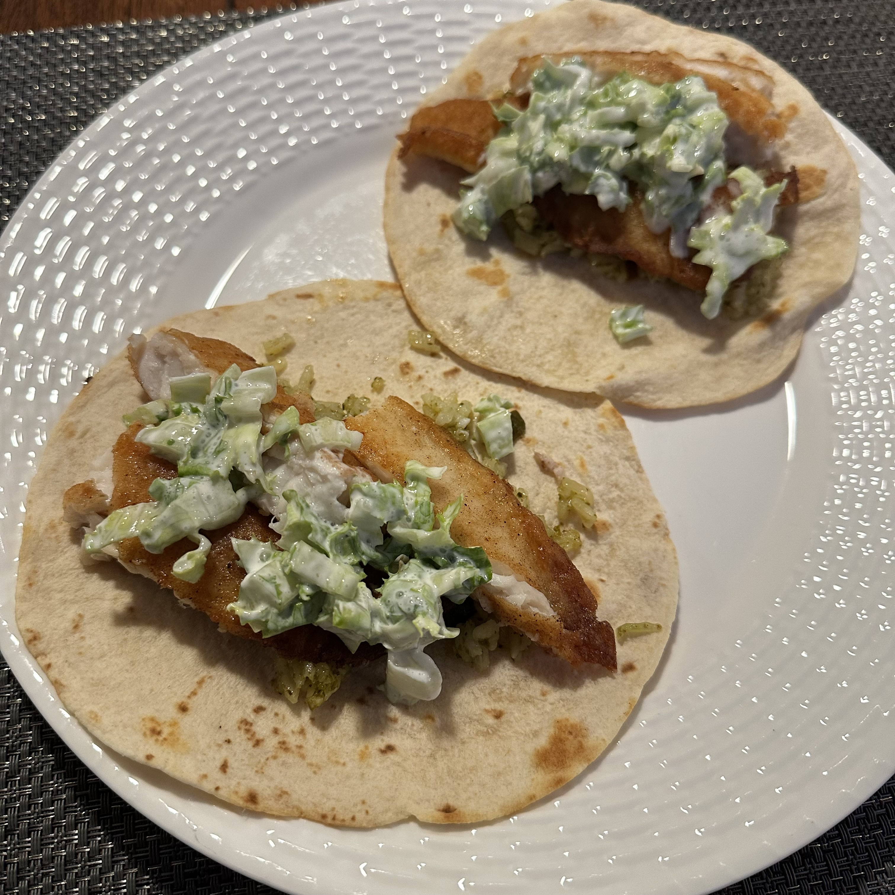 Today for lunch I went to DeNo’s. It was actually my fifth visit there this month. Yes, I keep track. I had a small tuna salad sub with american cheese, toasted and then topped with lettuce. It was really, really good. But it wasn’t as good as my dinner. I coated tilapia in seasoned flour and pan seared it. Then I made tacos with leftover rice verde, the tilapia, lettuce dressed with sour cream and lime, and some Guatemalan hot sauce.