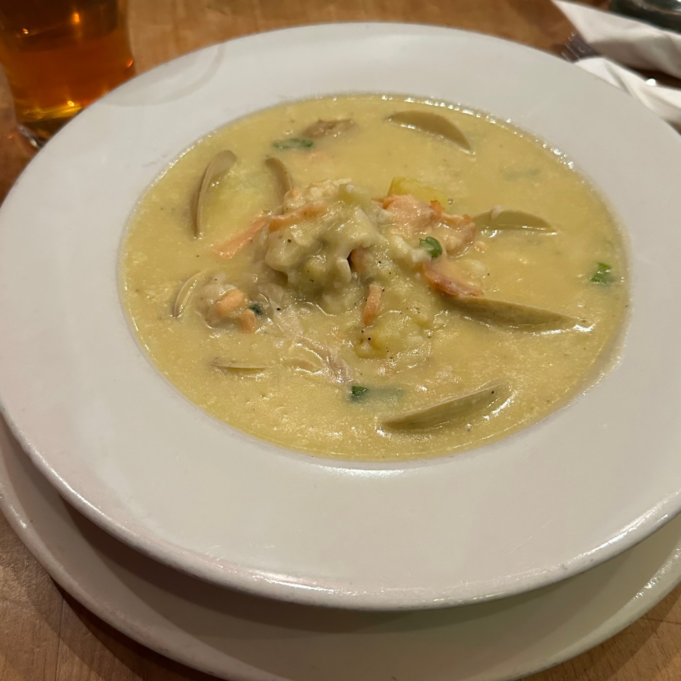 The clams in this chowder are very good, but the smoked salmon is the star of the dish. It has a robust flavor and every bite that includes it is excellent. The cod is also quite good. The potatoes are large and need to be cut to be enjoyed. The broth would benefit from more cream. Overall, this is a good chowder, but we will be digging into the Fish and Chips and the Sausage more often.