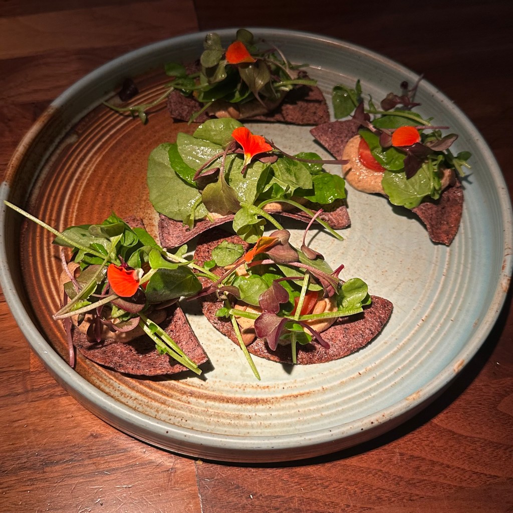 Toasted pumpkin seed spread with tomato, sour orange and habanero served on two tostadas