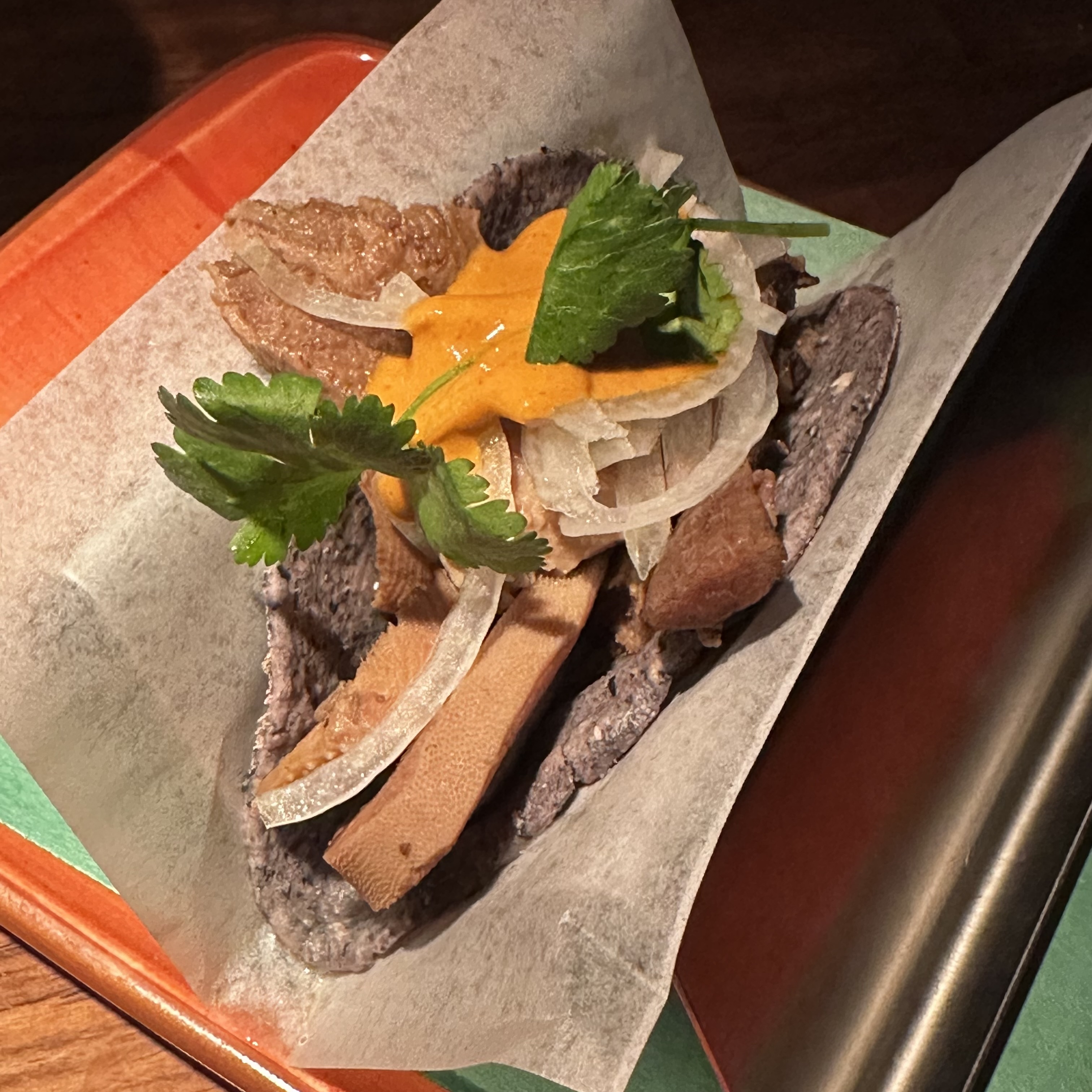 Braised Roseda Farms beef tongue with a spicy chile morita salsa, shaved white onion and cilantro